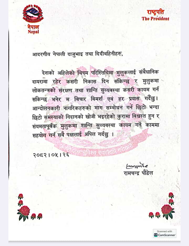 राष्ट्रपति पौडेलले भनेका छन्, “मुलुकलाई संवैधानिक दायरामा रहेर कसरी निकास दिन सकिन्छ र लोकतन्त्रको संरक्षण तथा शान्ति सुव्यवस्था कसरी कायम गर्न सकिन्छ भनेर म विचार विमर्श एवं हर प्रयास गर्दैछु।”