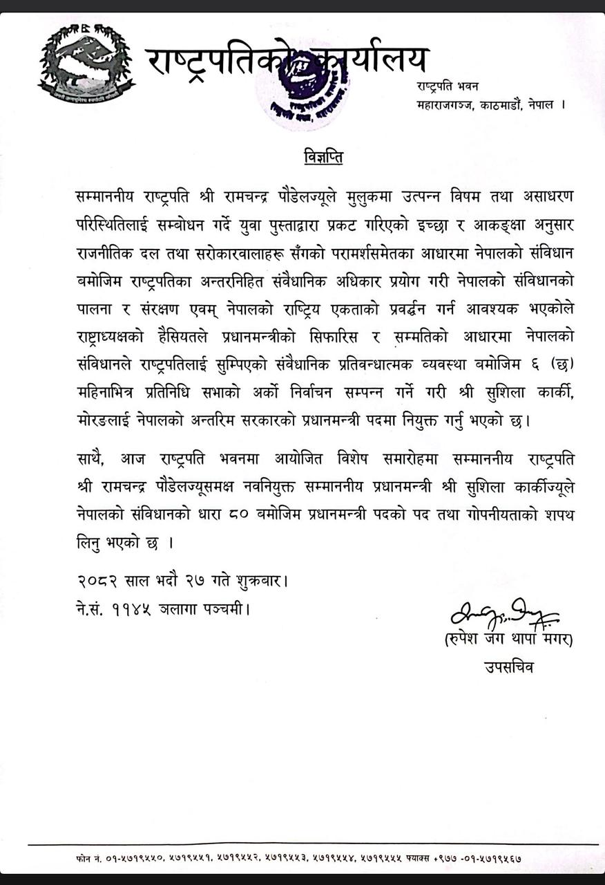 No Author Assigned | २०८२ भदौ २७ गते ०२:४४काठमाडौं । आगामी फागुन महिनाभित्र नयाँ जनादेशका लागि प्रतिनिधिसभाको निर्वाचन हुने भएको छ । राष्ट्रपति रामचन्द्र पौडेलले आगामी ६ महिनाभित्र प्रतिनिधिसभाको नयाँ निर्वाचन गर्ने गरी सुशीला कार्कीलाई प्रधानमन्त्रीमा नियुक्त गरेका हुन् ।