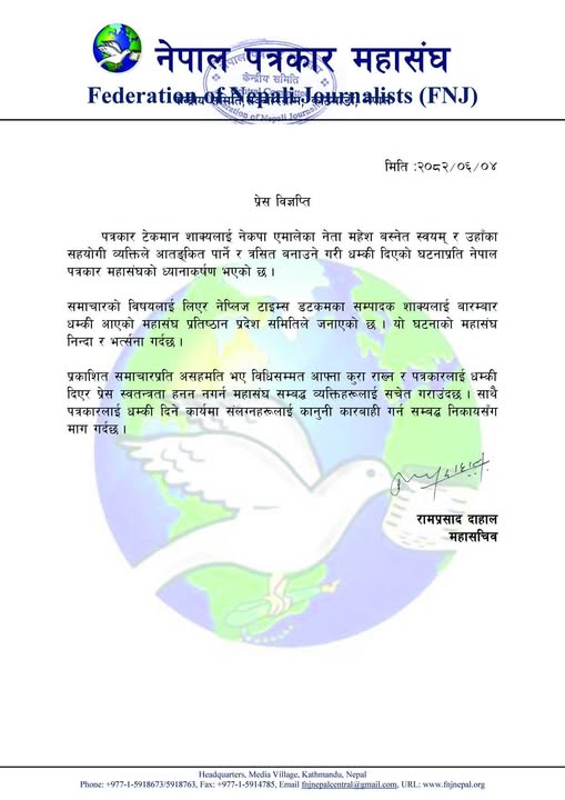 एमाले नेता महेश बस्नेतले पत्रकार शाक्यलाई धम्की दिएकोप्रति महासंघको ध्यानाकर्षण