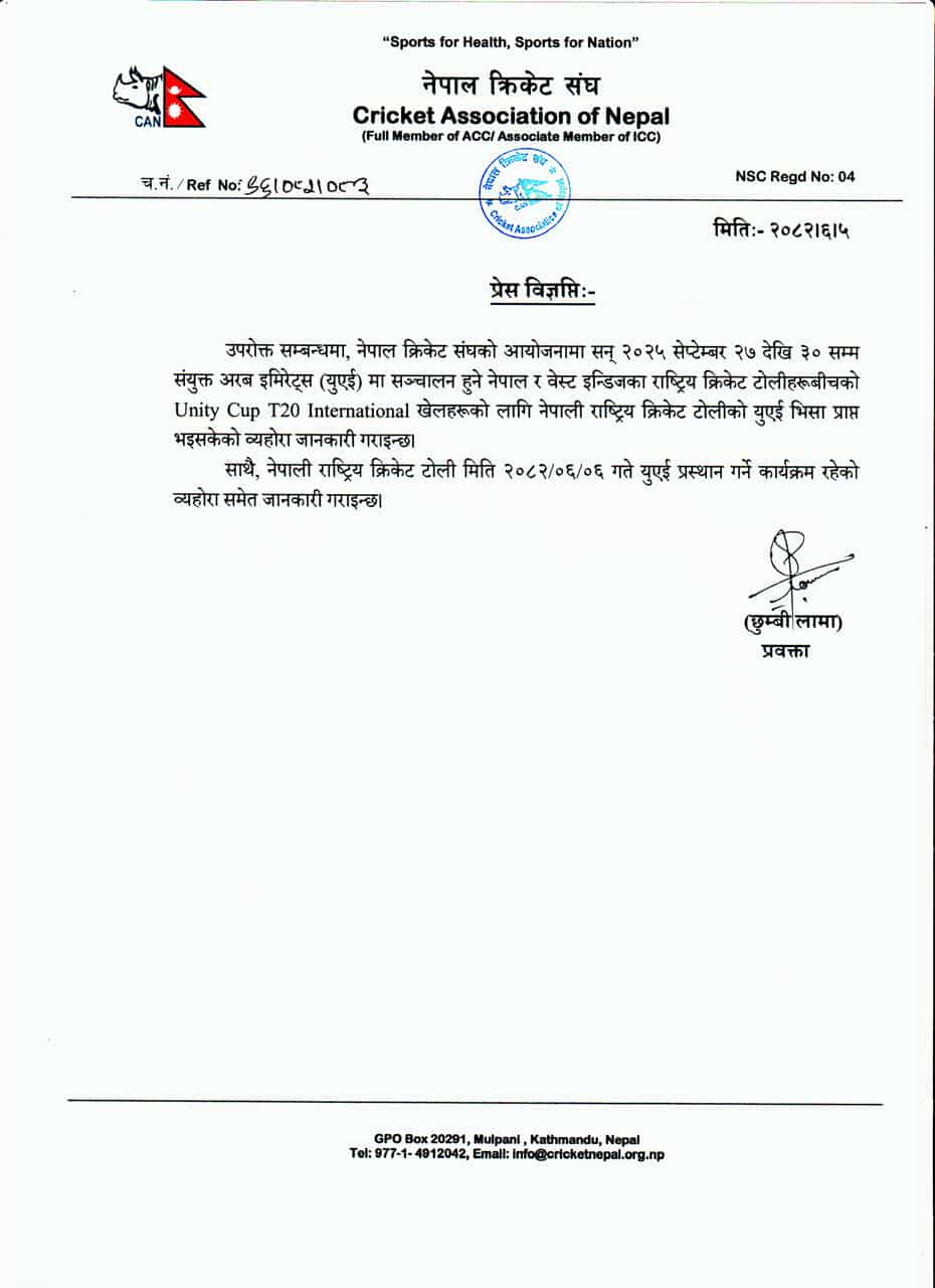 नेपालमा ‘जेनजी’ आन्दोलनका क्रममा हजारौं कैदीहरू जेलबाट भागेपछि युएईले नेपालीका लागि भिसा प्रक्रिया रोकेको थियो । तर, नेपाली खेलाडीहरूका लागि क्यानको विशेष पहलपछि भिसा जारी भएको हो । क्यानले यसका लागि इमिरेट्स क्रिकेट बोर्ड र अन्तर्राष्ट्रिय क्रिकेट परिषद् (आईसीसी) मा समेत समन्वय गरेको थियो ।