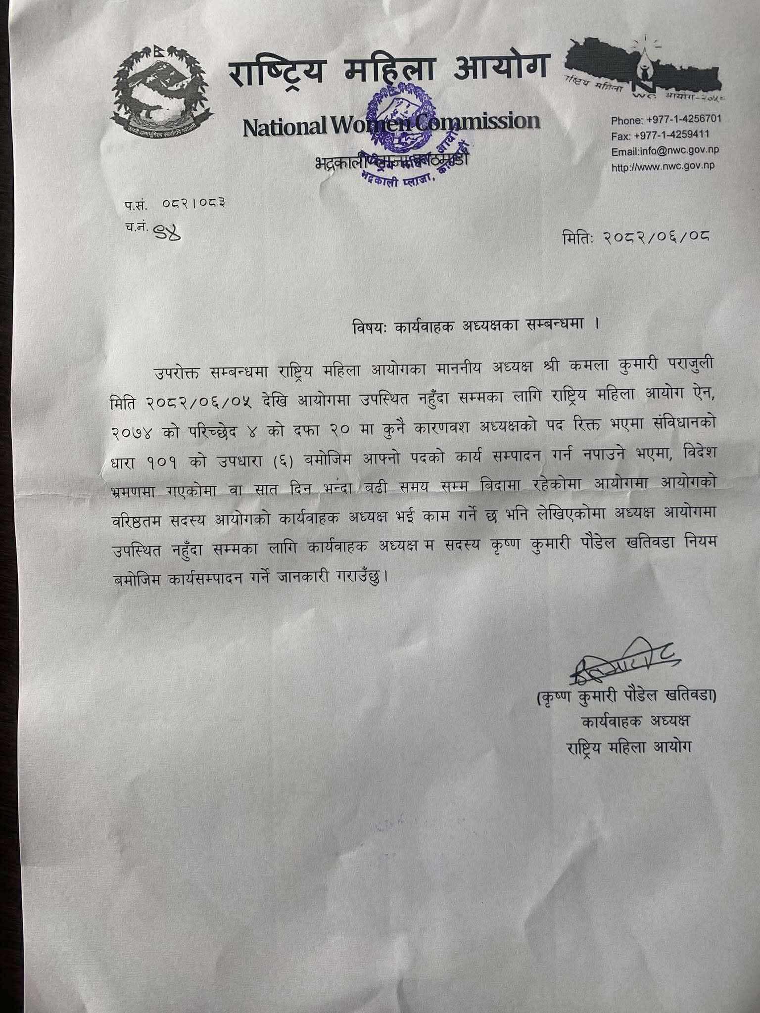 काठमाडौं । राष्ट्रिय महिला आयोगमा कार्यवाहक अध्यक्षको विषयलाई लिएर नयाँ विवाद उत्पन्न भएको छ । आयोगकी अध्यक्ष कमलाकुमारी पराजुली विदेश भ्रमणमा रहेको अवस्थामा सदस्य कृष्णकुमारी पौडेल खतिवडाले आफैँलाई कार्यवाहक अध्यक्ष तोकेकी छन् ।
