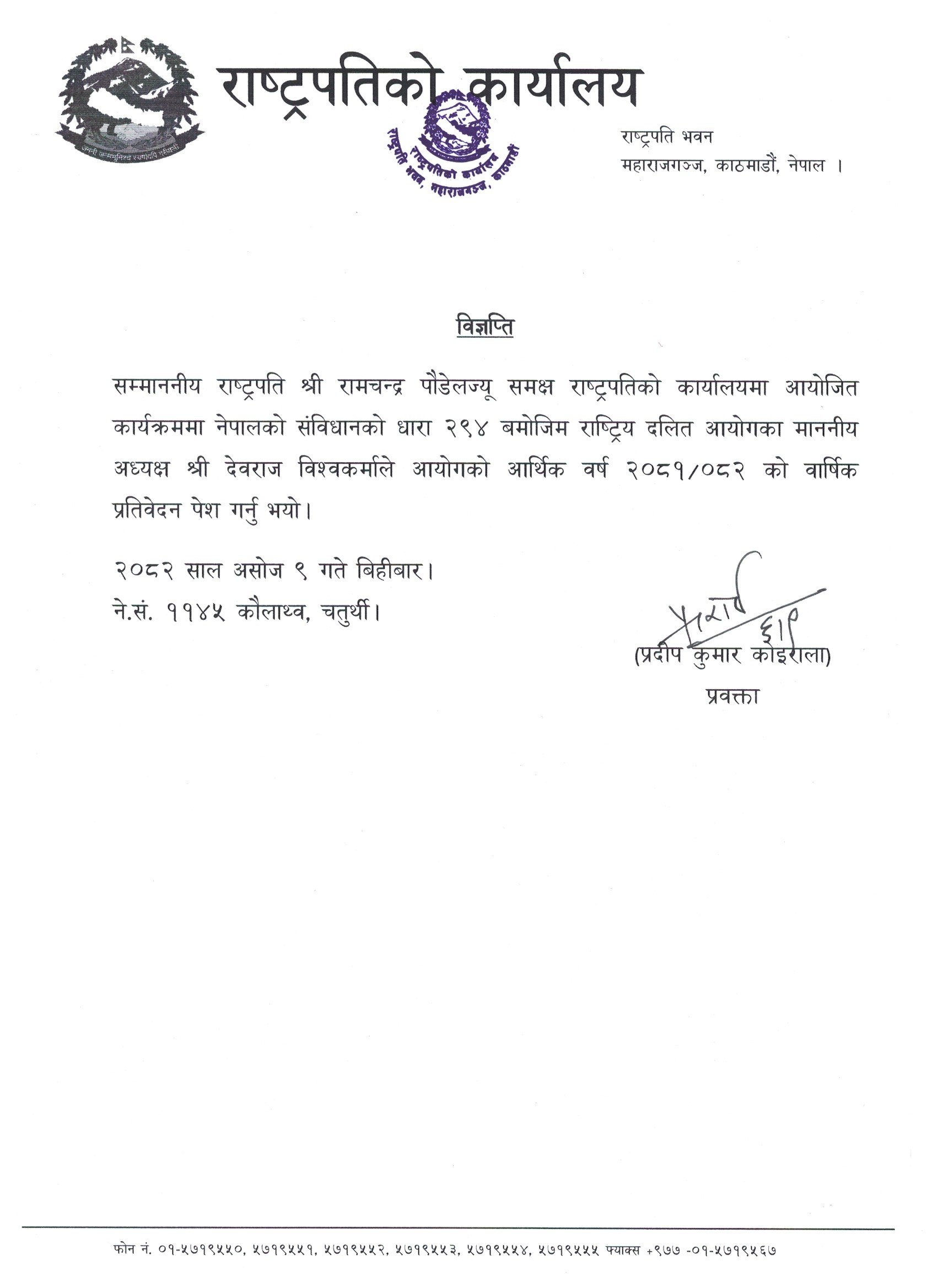 राष्ट्रपति कार्यालयका प्रवक्ता प्रदीप कोइरालाद्वारा हस्ताक्षरित विज्ञप्तिमा उक्त जानकारी दिइएको छ ।