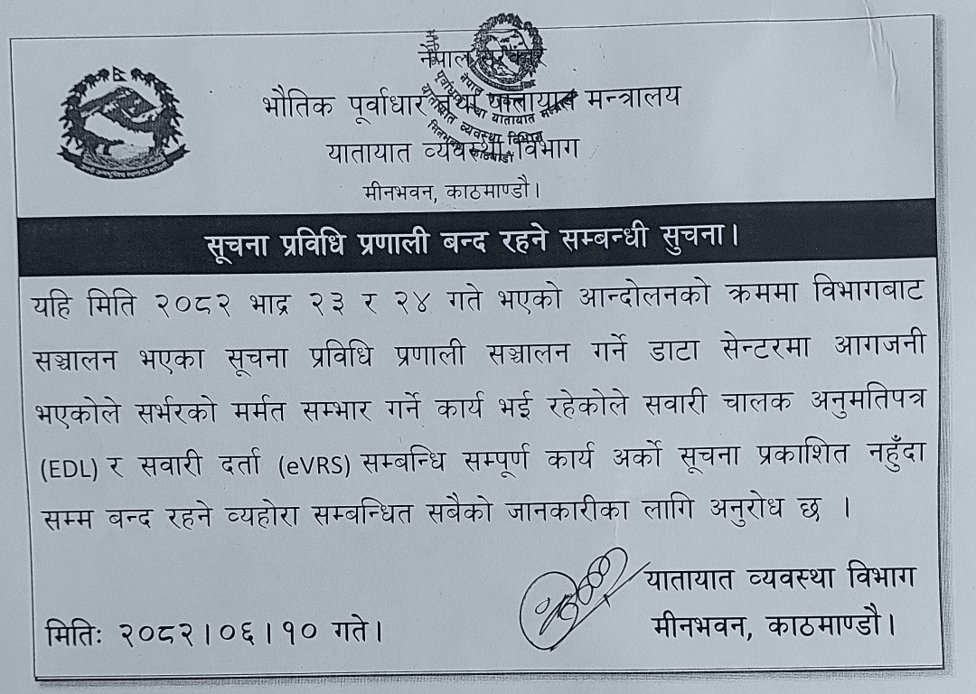 विभागले शुक्रबार सूचना जारी गर्दै भदौ २३ र २४ गतेको आन्दोलनका क्रममा मीनभवनस्थित डाटा सेन्टरमा क्षति पुगेकाले प्रणाली सञ्चालनमा समस्या आएको उल्लेख गरेको छ ।