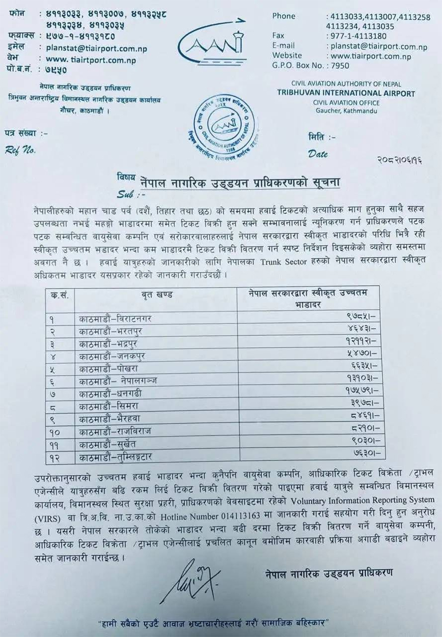 यात्रुहरूलाई बढी शुल्क लिने क्रम नियन्त्रण गर्नका लागि यो भाडादर तोकिएको हो, जसभन्दा बढी मूल्य नलिन प्राधिकरणले वायुसेवा कम्पनी र टिकट बिक्रेताहरूलाई अनुरोध गरेको छ ।