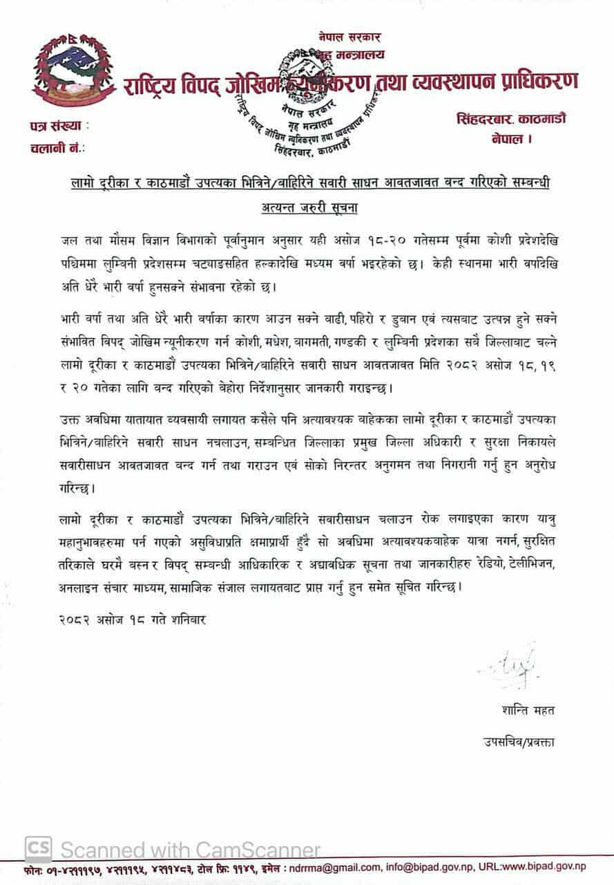 राष्ट्रिय विपद् जोखिम न्यूनीकरण तथा व्यवस्थापन प्राधिकरणले भारी वर्षाका कारण बाढी, पहिरो र डुबानको जोखिम बढेकाले उपत्यका भित्रिने र बाहिरिने सवारी साधन बन्द गरिएको जनाएको छ । असोज १८, १९ र २० गतेका लागि सवारीसाधान आवतजावत बन्द गरिएको प्राधिकरणले जनाएको छ ।