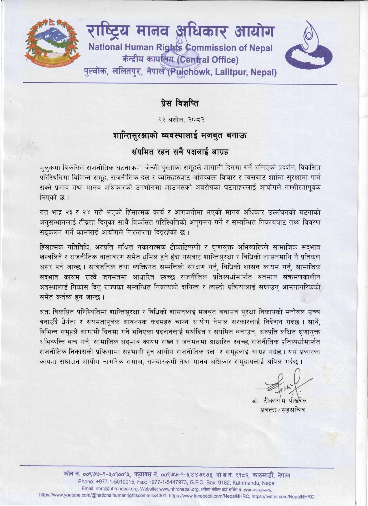 काठमाडौं । राष्ट्रिय मानव अधिकार आयोगले मुलुकको विकसित परिस्थितिमा शान्ति सुरक्षा बलियो बनाउन र सबै पक्षलाई संयम र मर्यादित रहन आग्रह गरेको छ ।