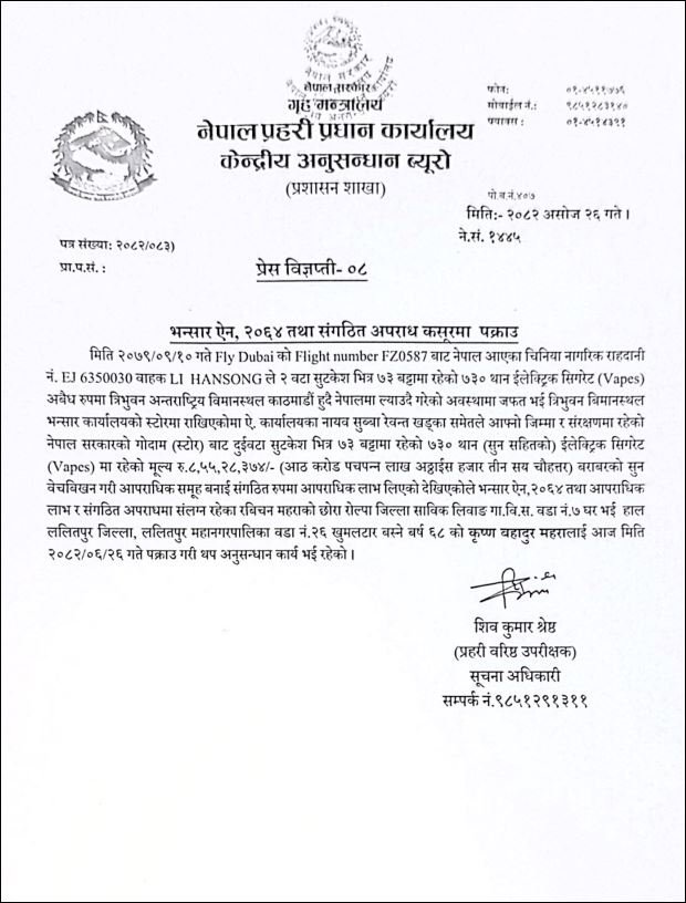 महरालाई ’भेप’ (Vape) मार्फत भएको सुन तस्करी प्रकरणको अनुसन्धानका क्रममा नियन्त्रणमा लिइएको सीआईबीले विज्ञप्ति जारी गर्दै पुष्टि गरेको छ ।