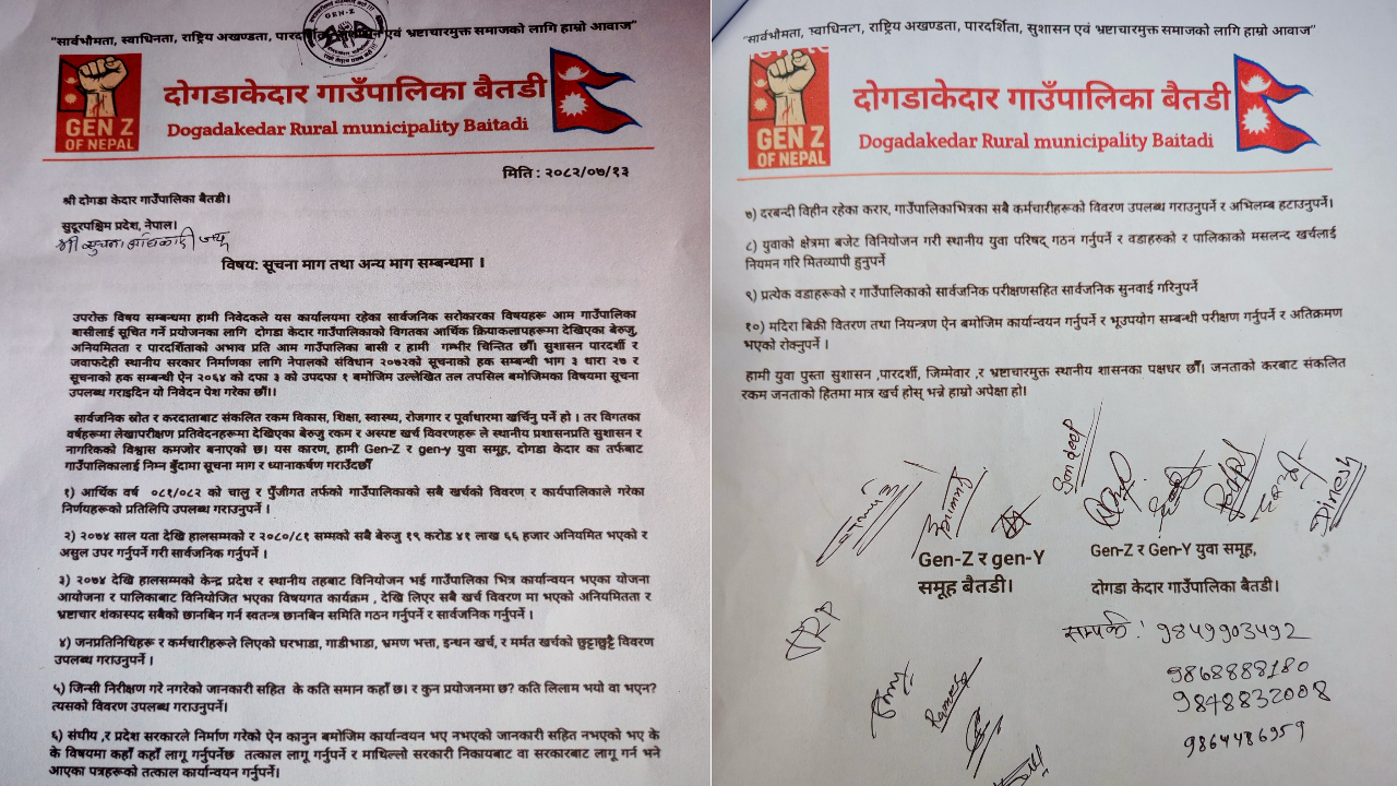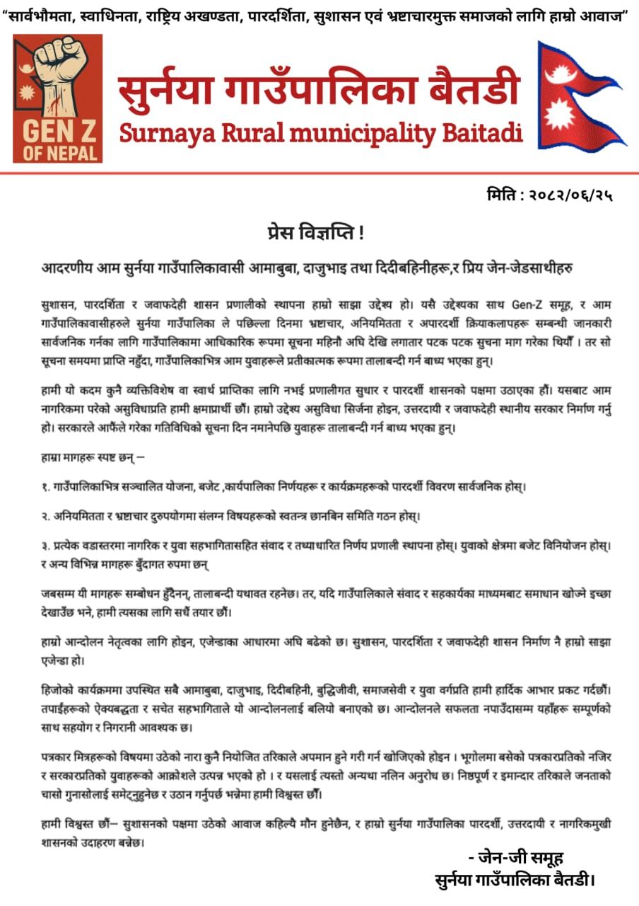 यसबाहेक गाउँपालिकामा रहेका जिन्सी सामानहरूको निरीक्षण, लिलाम तथा प्रयोगको विवरण सार्वजनिक गर्नुपर्ने, प्रत्येक वडा तथा गाउँपालिकाको सामाजिक परीक्षण गरी सार्वजनिक सुनुवाइ गर्नुपर्ने र गाउँपालिका स्तरीय खेलमैदान निर्माणका लागि बजेट विनियोजन गर्नुपर्ने माग पनि जेन–जी युवाहरूले राखेका छन् ।