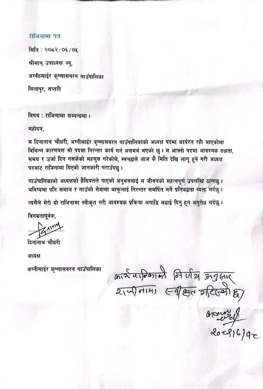 ‘म दिनानाथ चौधरी, अग्नीसाईर कृष्णासवरन गाउँपालिकाको अध्यक्ष पदमा कार्यरत रही आएकोमा विभिन्न कारणवश सो पदमा निरन्तर कार्य गर्न असमर्थ भएको छु । पदमा आवश्यक दक्षता, समय र ऊर्जा दिन नसकेको महसुस भएकाले स्वेच्छाले नै राजीनामा दिएको छु’ उनले पत्रमा लेखेका छन् ।