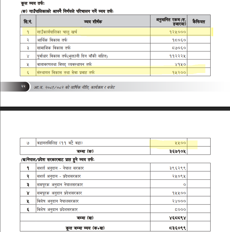 १६ करोड ७१ लाख ५३ हजार मात्रै विकास बजेटमा पालिकाले छुट्यायो । यही आर्थिक वर्ष करारका कर्मचारीको तलब खुवाउन नसकेर पालिकाले विकास बजेट काटेर तलब खुवाएको थियो । यो आर्थिक वर्षमा पालिकाले एक करोड ४० लाखको आन्तरिक आय अनुमान गरेको थियो । तर ५० लाखको आसपास आन्तरिक आय उठेको थियो ।