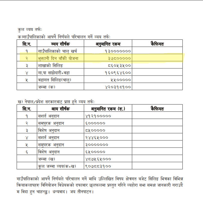 अघिल्लो आर्थिक वर्ष भूमि आयोगको काम भएका कारण पालिकाले आर्थिक वर्ष २०८१/०८२ मा एक करोड आसपास आन्तरिक आय पनि उठाएको थियो । तर घाटा बजेट बनाएर आन्तरिक आय ३ करोड ७० लाख प्रक्षेपण गर्दा एक करोड आसपास उठेको आन्तरिक आयबाट पनि त्यो पैसा घटेको देखिँदैन । बरु अझ थपिएर यस आर्थिक वर्षमा अघिल्लो आर्थिक वर्षको तिर्न बाँकी शीर्षकमा ३ करोड ७८ लाख रुपैयाँ थपिएको छ ।