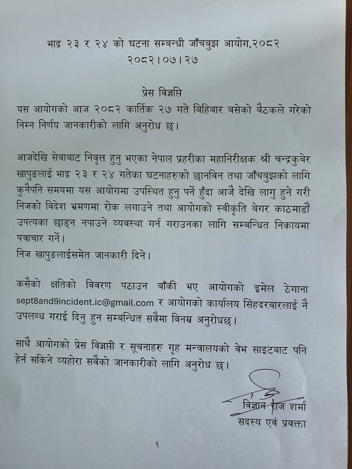 गत भदौ २३ र २४ गते भएको घटनाका बारेमा छानबिन गर्न बनेको उच्चस्तरीय जाँचबुझ आयोगले आज एक विज्ञप्ति जारी गर्दै खापुङलाई विदेश भ्रमण र उपत्यका छाड्न रोक लगाएको बारे जानकारी गराएको हो ।