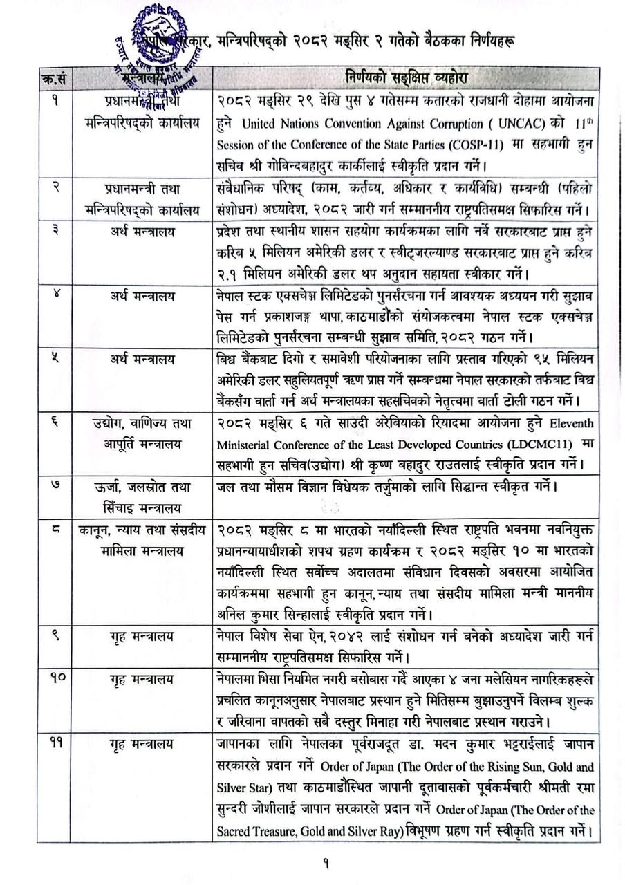 यी हुन् मन्त्रिपरिषद् बैठकका मुख्य २५ निर्णय (सूचीसहित)