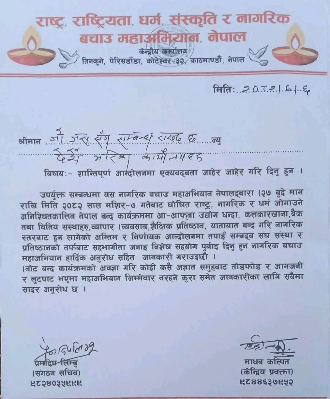 विज्ञप्तिमा सबै संघ–संस्था, नागरिक, समर्थक तथा सरोकारवाला पक्षलाई विशेष सावधानी अपनाई आन्दोलनमा साथ दिन र अभियानका कार्यक्रमहरू अनुशासित ढंगले सञ्चालन गर्न अनुरोध गरिएको छ।