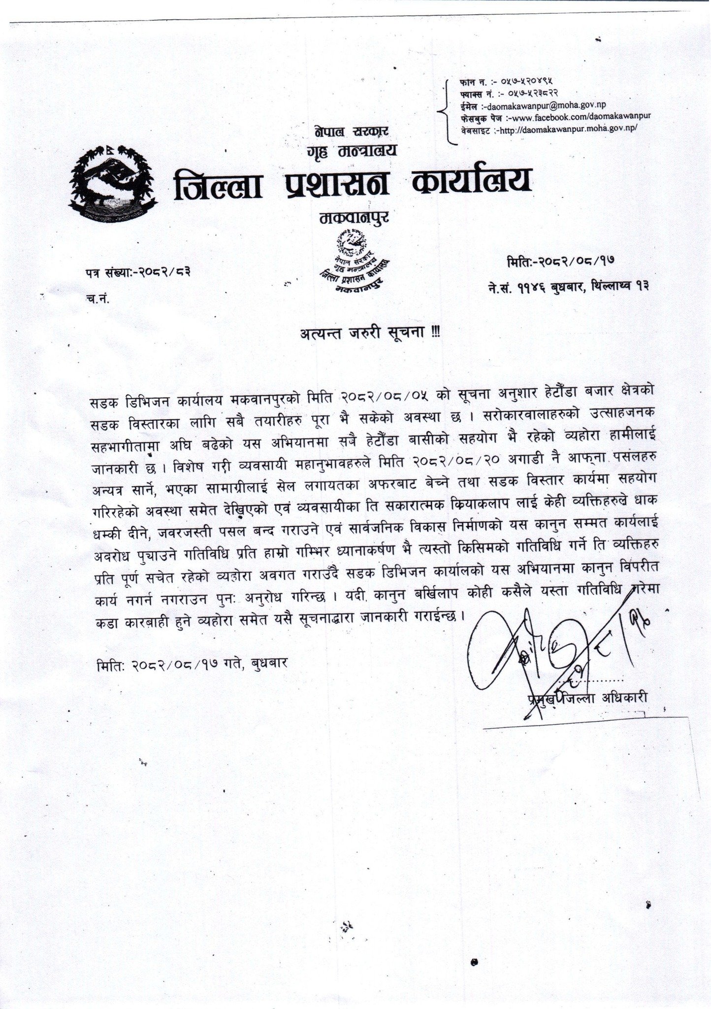 मकवानपुर । जिल्ला प्रशासन कार्यालय मकवानपुरले हेटौँडा बजार क्षेत्रको सडक विस्तार कार्यमा बाधा पुर्याउने वा व्यवसायीहरूलाई धम्की दिने समूहलाई कडा कानुनी कारबाहीको दायरामा ल्याउने चेतावनी दिएको छ ।