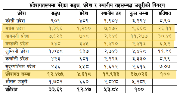 प्रदेशगत रूपमा हेर्दा बागमती प्रदेशमा सबैभन्दा धेरै ११ हजार २७७ उजुरी परेका छन्, तीमध्ये २ हजार ९४६ वटा उजुरी स्थानीय तहसँग सम्बन्धित छन् । यस्तै, गण्डकी प्रदेशमा सबैभन्दा कम २ हजार ४१३ वटा उजुरी परेका थिए, तीमध्ये १ हजार ४२० उजुरी स्थानीय तहविरुद्ध छन् ।