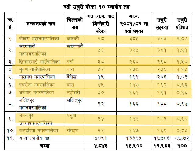 यस्तै, अख्तियारले सबैभन्दा बढी उजुरी परेका १० स्थानीय तहको नामावलीसहित सूची पनि सार्वजनिक गरेको छ । अख्तियारले सार्वजनिक गरेको शीर्ष १० स्थानीय तहको सूची हेर्दा आर्थिक अनियमितता र भ्रष्टाचारको ‘सिन्डिकेट’ सहरी क्षेत्रदेखि ग्रामीण भेगसम्म फैलिएको देखिन्छ ।