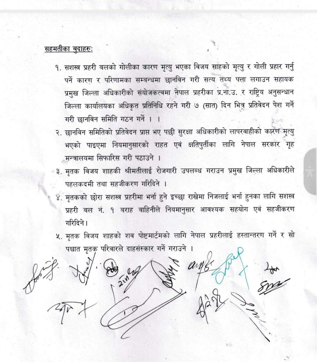 छलफलका क्रममा मृतककी श्रीमती र छोरालाई रोजगारीको व्यवस्था गर्ने र तनावपूर्ण स्थिति साम्य पार्न लौकहीस्थित सशस्त्र प्रहरीको बोर्डर आउट पोष्टको टोलीलाई तत्कालका लागि त्यहाँबाट फिर्ता गराउने सहमति भएको सुनसरीका प्रमुख जिल्ला अधिकारी वासुदेव घिमिरेले जानकारी दिएश्र