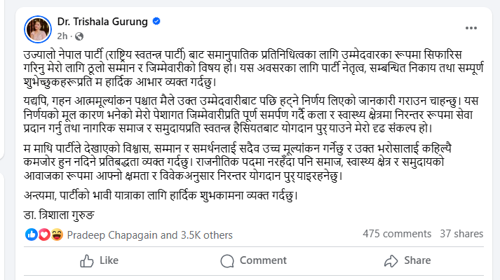 काठमाडौं — राष्ट्रिय स्वतन्त्र पार्टी (रास्वपा) को समानुपातिक उम्मेदवार सूचीमा समावेश भएकी गायिका तथा चिकित्सक डा. त्रिशाला गुरुङले उम्मेदवारीबाट पछि हट्ने घोषणा गरेकी छन्।
