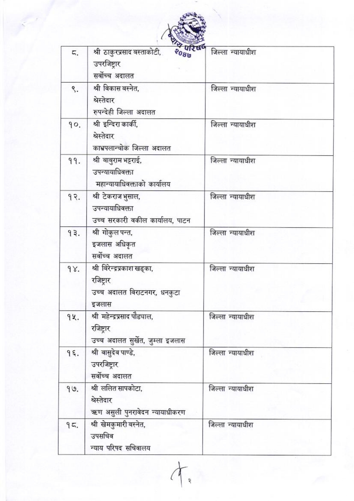 त्यस्तै, श्रेस्तेदारहरू ताराप्रसाद डाँगी, विकास बस्नेत, इन्दिरा कार्की र ललित सापकोटा पनि जिल्ला न्यायाधीशका लागि सिफारिस भएका छन् । न्याय सेवाकै उपसचिवहरू हिरालाल भुसाल, डिल्लीप्रसाद आचार्य, सुमन पाण्डे र खेमकुमारी बस्नेत सूचीमा समेटिएका छन् ।