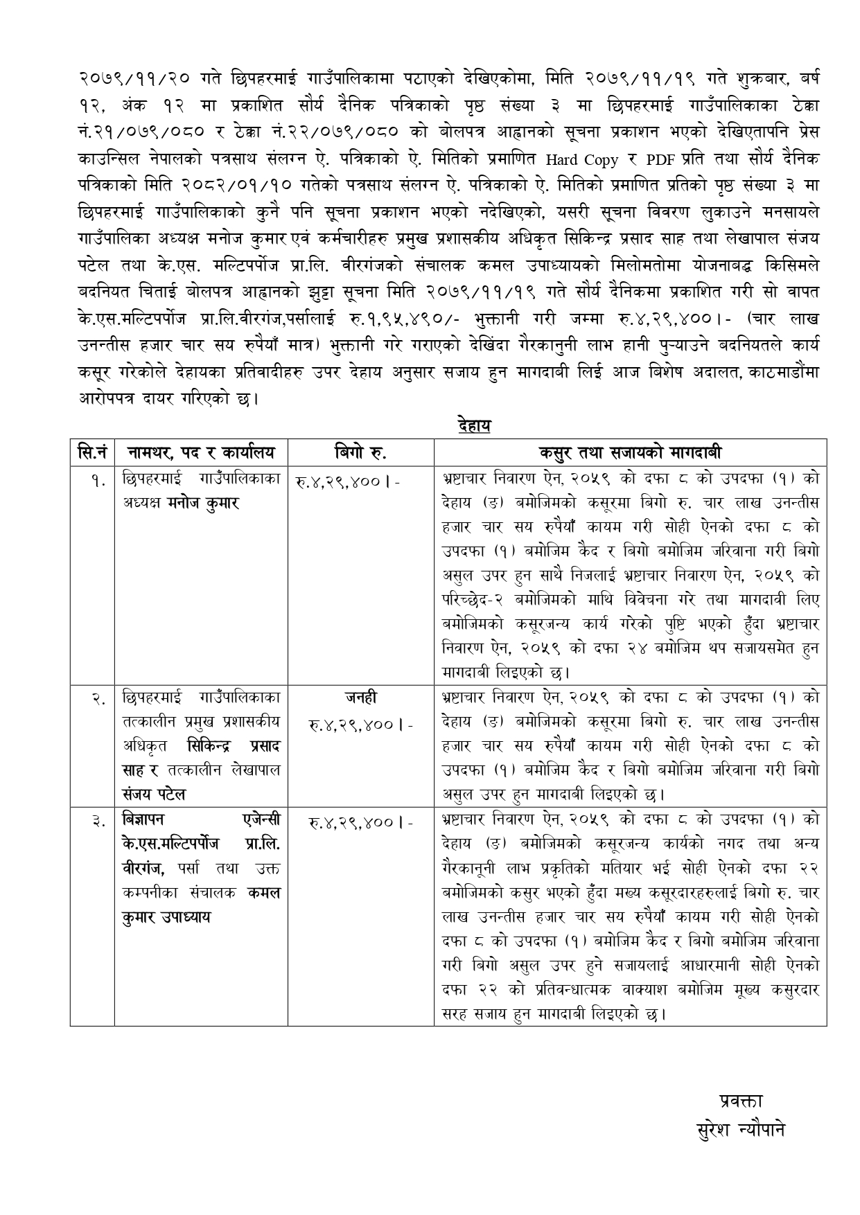 काठमाडौं । पर्साको छिपहरमाई गाउँपालिकामा बोलपत्र (टेन्डर) आह्वानको झुट्टा सूचना खडा गरी भ्रष्टाचार गरेको अभियोगमा अख्तियार दुरुपयोग अनुसन्धान आयोगले गाउँपालिका अध्यक्षसहितका कर्मचारी र व्यवसायीविरुद्ध विशेष अदालतमा मुद्दा दायर गरेको छ ।