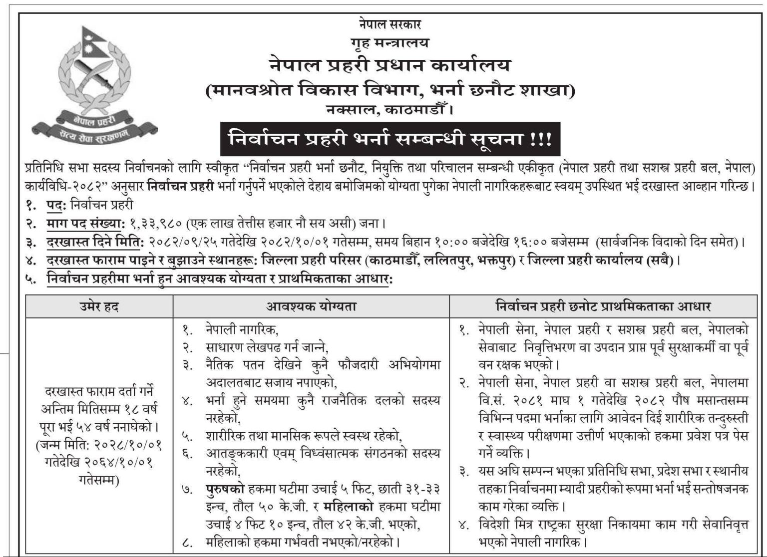 प्रहरी प्रधान कार्यालयको मानवस्रोत विकास विभाग, भर्ना छनोट शाखाले एक सूचना जारी गर्दै निर्वाचन सुरक्षाका लागि कुल १ लाख ३३ हजार ९८० जना जनशक्ति माग गरेको हो ।