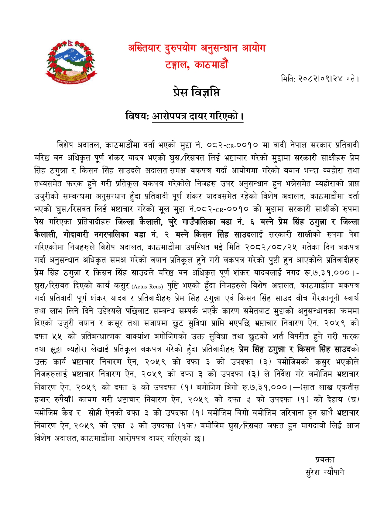 वरिष्ठ वन अधिकृत पूर्ण शंकर यादवले ७ लाख ३१ हजार रुपैयाँ घुस लिएको भ्रष्टाचार मुद्दामा सरकारी साक्षीका रूपमा रहेका कैलालीका प्रेम सिंह ठगुन्ना र किसन सिंह साउदले अदालतमा बयान फेरेपछि अख्तियारले उनीहरूलाई नै प्रतिवादी बनाएर मुद्दा चलाएको हो ।