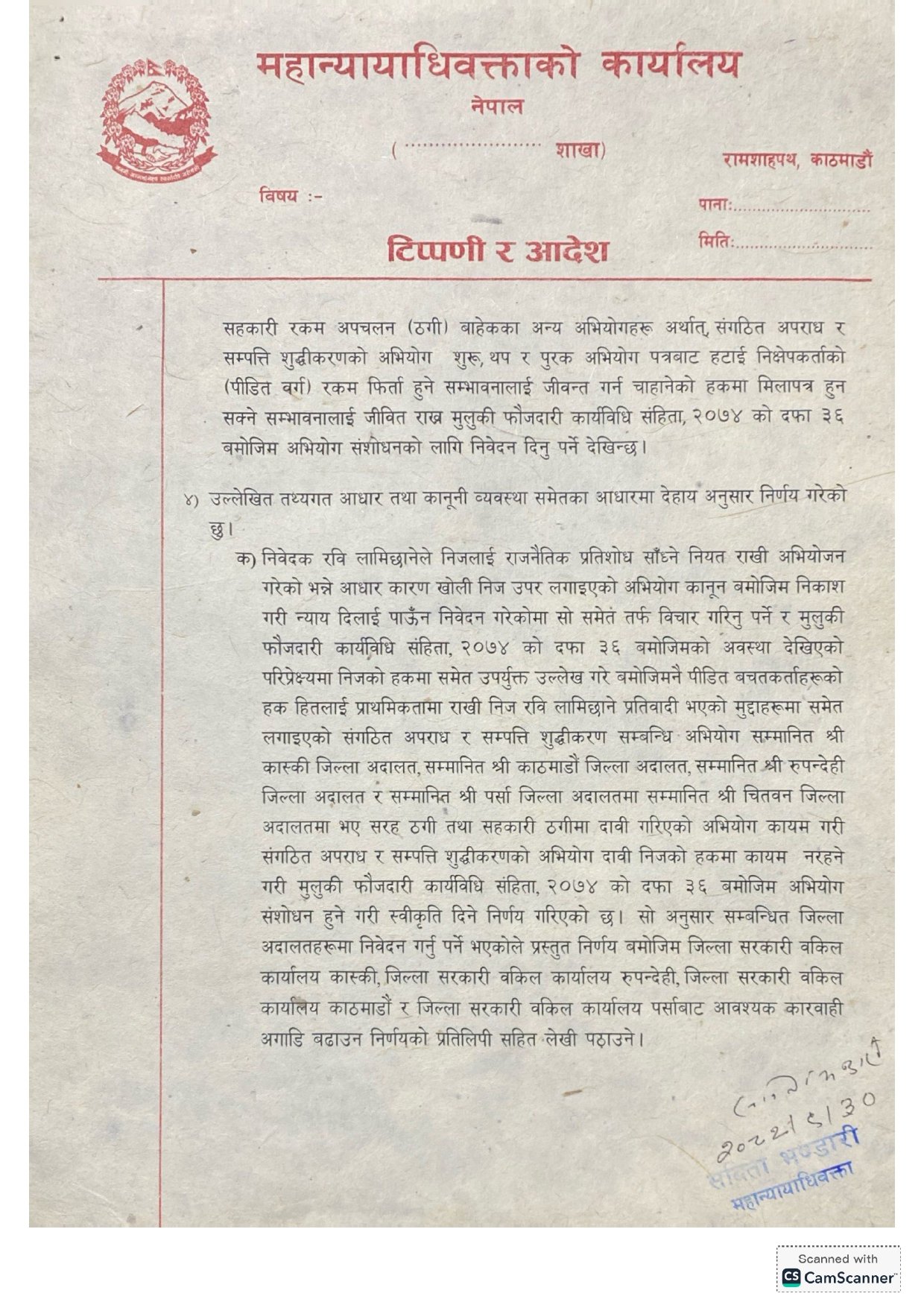 महान्यायाधिवक्ता यो निर्णयसँगै सम्बन्धित जिल्ला सरकारी वकिल कार्यालयले लामिछानेविरुद्धको मुद्दा फिर्ता लिन सक्नेछन् ।