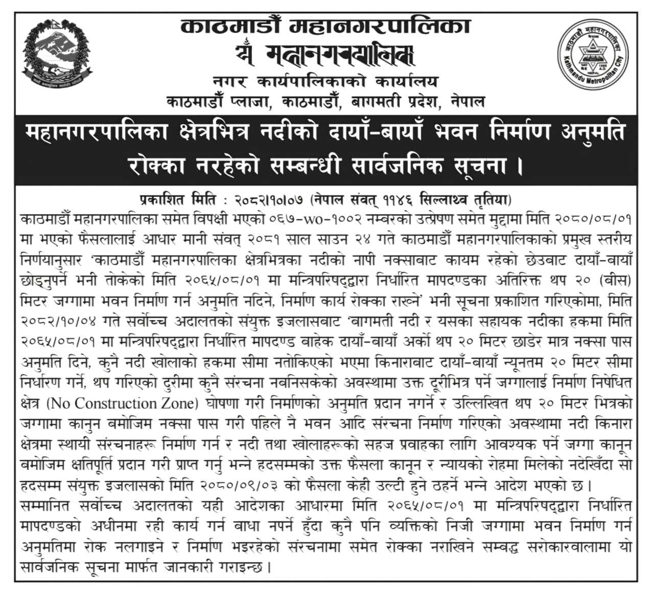सर्वोच्च अदालतले आफ्नो अघिल्लो फैसला उल्ट्याएपछि महानगरले बुधबार सार्वजनिक सूचना जारी गर्दै नदी किनाराका निजी जग्गामा भवन निर्माण रोक्का नगर्ने स्पष्ट पारेको हो ।