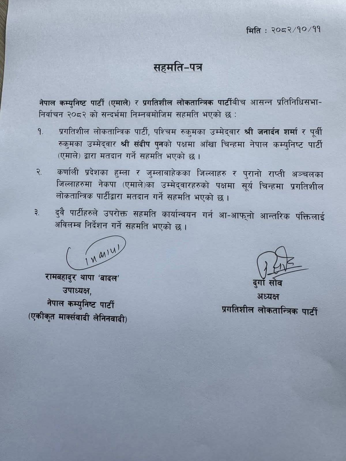 काठमाडौँ । नेकपा एमाले र प्रगतिशील लोकतान्त्रिक पार्टी (प्रलोपा) बीच आगामी प्रतिनिधिसभा निर्वाचनका लागि जिल्लागत रूपमा चुनावी तालमेल गर्ने लिखित सहमति भएको छ ।