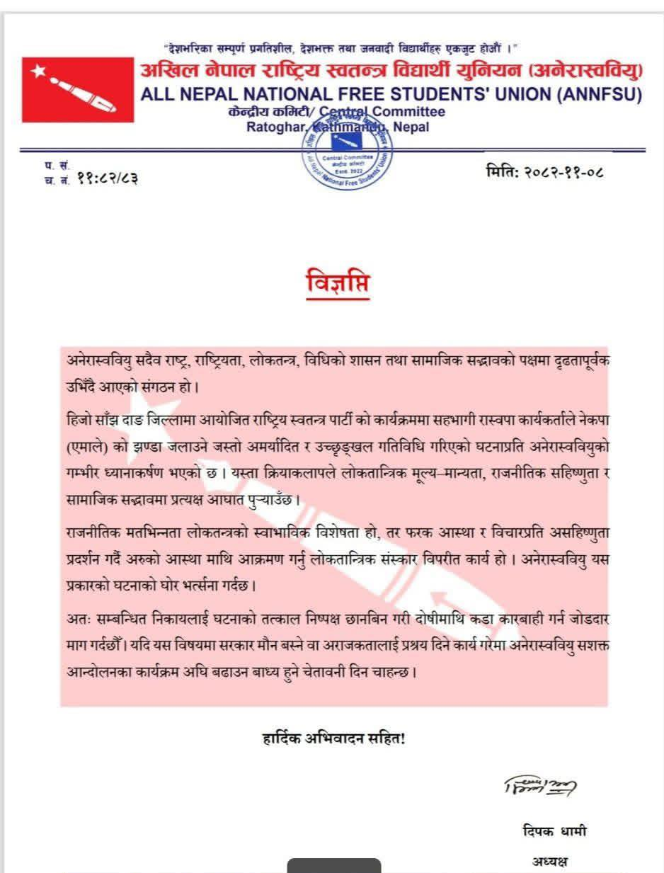 दाङमा रास्वपा कार्यकर्ताले ‘सूर्य’ अंकित झण्डा जलाएर लोकतान्त्रिक मूल्य–मान्यता, राजनीतिक सहिष्णुता र सामाजिक सद्भावमा आघात पुर्याएको भन्दै अनेरास्ववियुले यस्तो चेतावनी दिएको हो ।