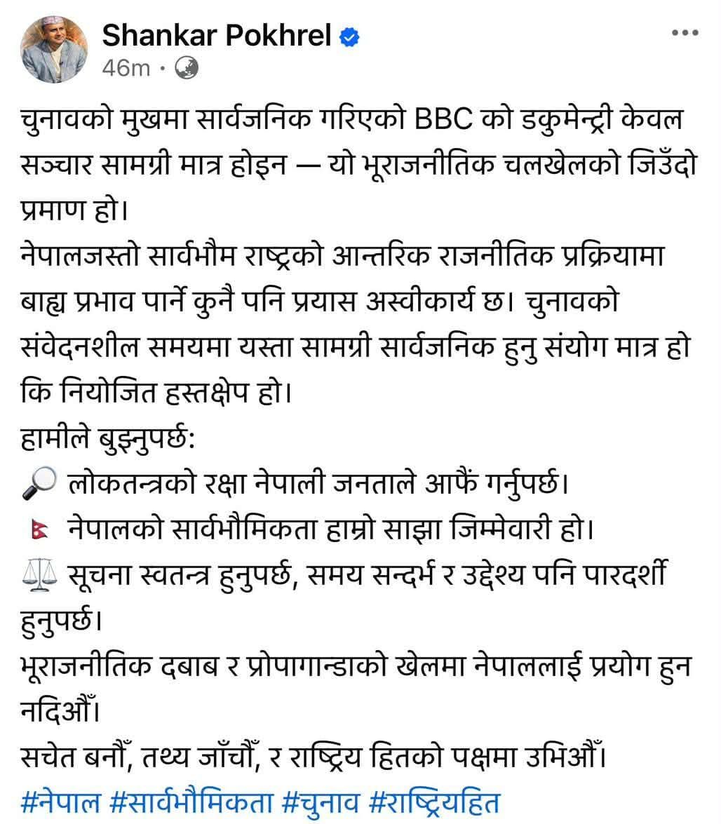 पोखरेलले भने, “चुनावको मुखमा सार्वजनिक गरिएको बीबीसीको डकुमेन्ट्री केवल सञ्चार सामग्री मात्र होइन, यो भूराजनीतिक चलखेलको जिउँदो प्रमाण हो।” उनले लोकतन्त्रको रक्षा नेपाली जनताले आफैँ गर्नुपर्ने र नेपालको सार्वभौमिकता सबैको साझा जिम्मेवारी भएको पनि जोड दिएका छन्।