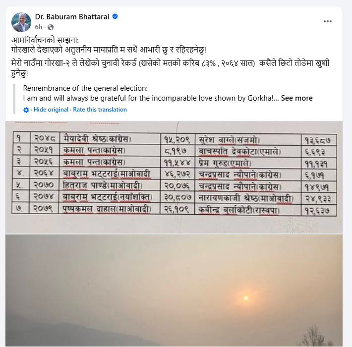 काठमाडौं । प्रतिनिधिसभा सदस्यका लागि देशभर मतदान भइरहेका बेला पूर्वप्रधानमन्त्री तथा प्रगतिशील लोकतान्त्रिक पार्टीका संरक्षक डा. बाबुराम भट्टराईले २०६४ सालको आम निर्वाचनमा आफूले बनाएको रेकर्ड सम्झिएका छन्।