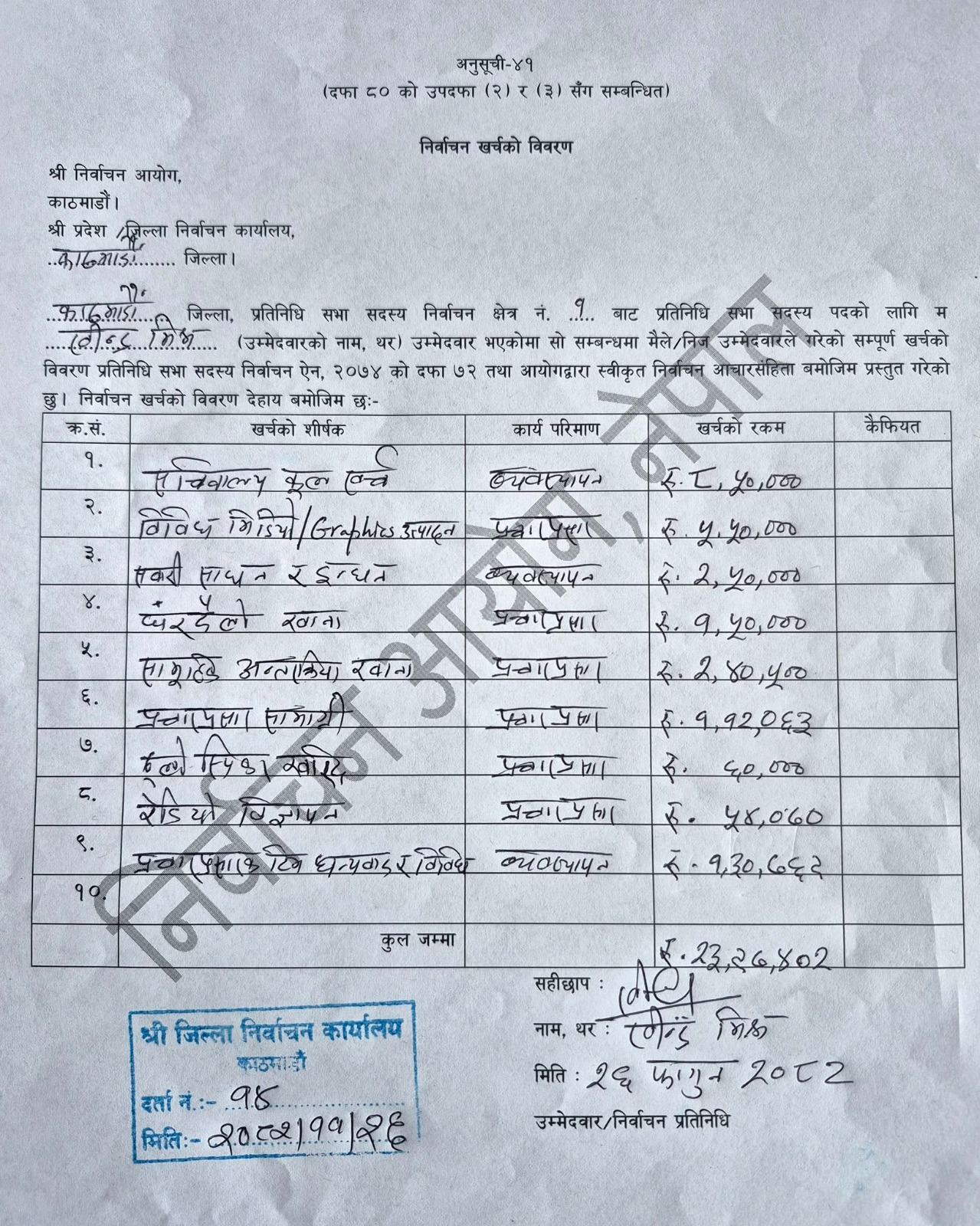 उनले आज जिल्ला निर्वाचन कार्यालय, काठमाडौंमा तोकेको सीमाभित्र २३ लाख ९७ हजार भन्दाबढी खर्च गरेको विवरण बुझाएका हुन् ।