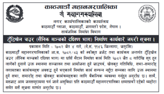 सूचनामा भनिएको छ, ‘उक्त स्थानमा सञ्चालन तथा आयोजना हुने चाडपर्व, खेलकुद गतिविधि, सभा–समारोह लगायतका कार्यक्रमहरू अवरुद्ध हुने भएकाले निर्माण कार्य सम्पन्न नहुँदासम्मका लागि वैकल्पिक व्यवस्था गर्नुहुन अनुरोध छ ।’