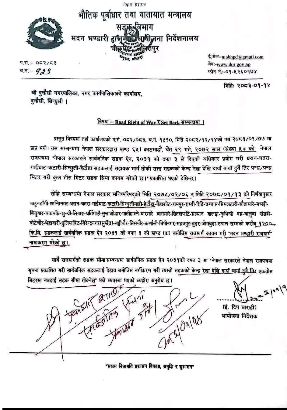 यही बिन्दुबाट भ्रम सुरु भएको देखिन्छ। सामाजिक सञ्जालमा भाइरल भएको पत्रले ३१/३१ मिटर सीमा उल्लेख गरेपछि धेरैले यसलाई तत्काल लागू भइसकेको ठाने। तर पत्रको सन्दर्भ हेर्दा, यो कुनै राष्ट्रव्यापी कार्यान्वयन निर्णय नभई स्थानीय तहमा उठेको एउटा प्राविधिक जिज्ञासाको जवाफ थियो। दुधौली नगरपालिकामा घरको नक्सा पास गर्ने क्रममा एक सेवाग्राहीले मदन भण्डारी राजमार्गको ३१ मिटरभित्रै निर्माण प्रस्ताव गरेपछि पालिकाले स्पष्टता खोजेको थियो। सुरूमा मौखिक रूपमा १५/१५ मिटर जानकारी दिइए पनि, लिखित जवाफमा ३१/३१ मिटर “मानक” उल्लेख भएपछि यही पत्र सार्वजनिक भयो र व्यापक रूपमा फैलियो।