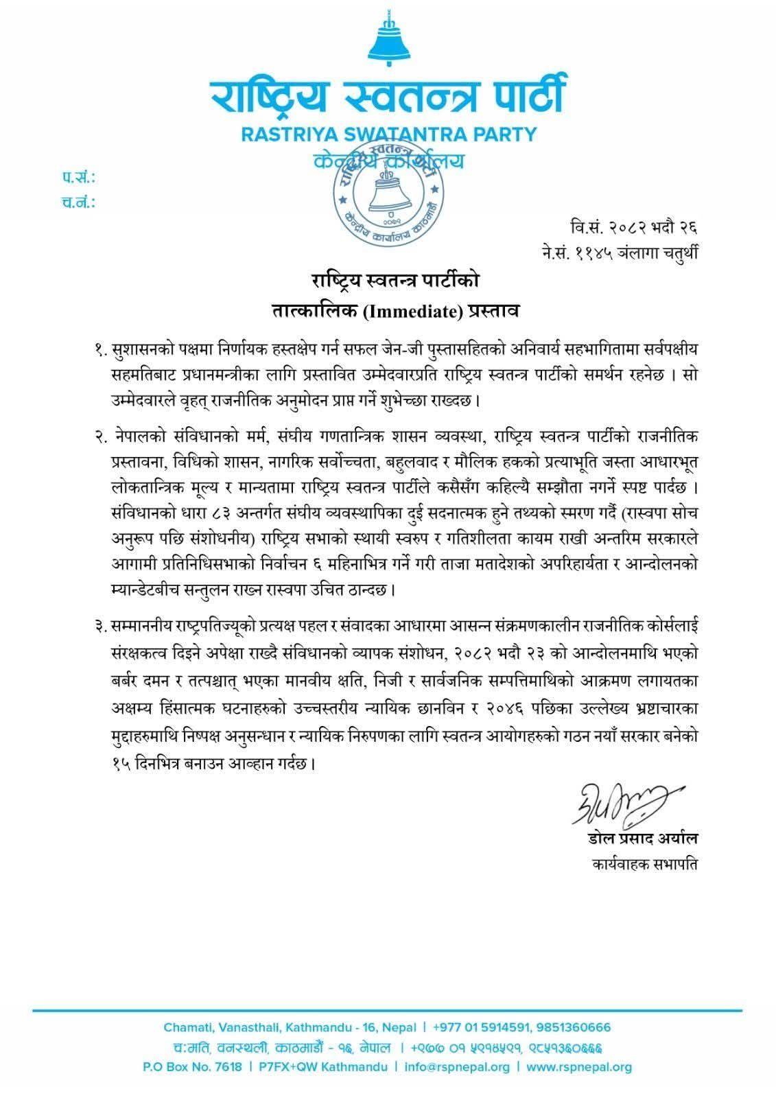 जेनजीसहितको सर्वपक्षीय सहमतिबाट प्रस्तावित प्रधानमन्त्रीमा समर्थन रहन्छः रास्वपा