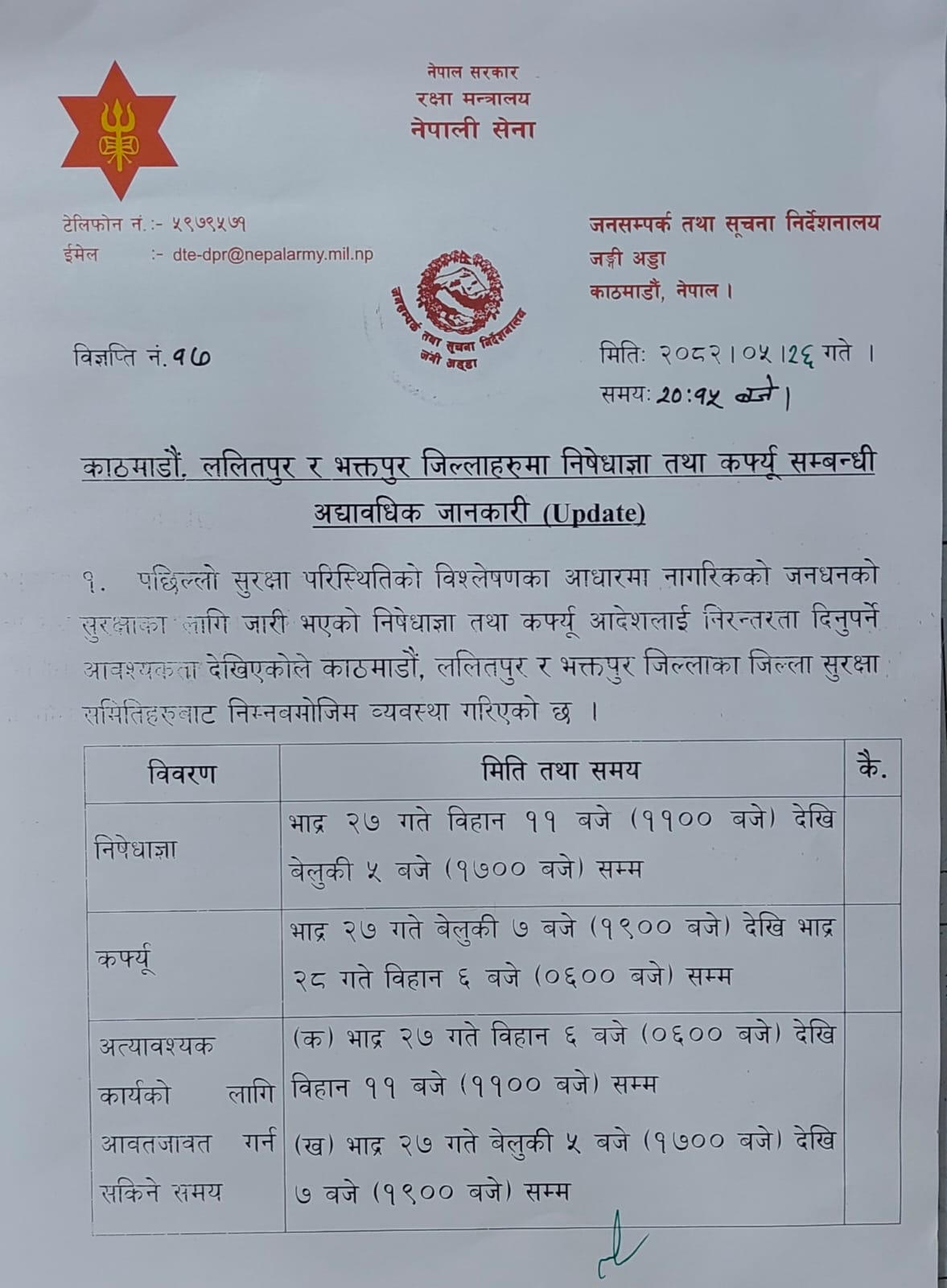 काठमाडौं । नेपाली सेनाले भोलि पनि दिनभर निषेधाज्ञा र राति कर्फ्यू लाग्ने जानकारी गराएको छ । बिहीबार साँझ सेनाको मुख्यालय जंग्गीअड्डाले जारी गरेको विज्ञप्ति अनुसार काठमाडौं, भक्तपुर र ललितपुरमा भोलि (भदौ २७) गते बिहान ११ बजेबाट बेलुकी ५ बजेसम्म निषेधाज्ञा लाग्नेछ भने साँझ ७ बजेबाट रातभर कर्फ्यू आदेश जारी गरिएको छ । साथै बिहान ६ देखि ११ बजे र साँझ ५ देखि ७ बजेसम्मको समयमा भने अत्यावश्यक कार्यका लागि आवतजावत गर्न सकिने सेनाले छ ।