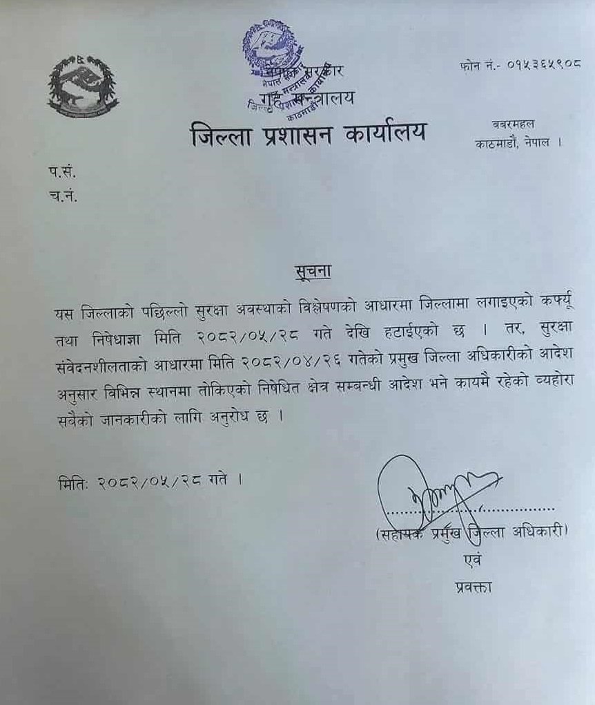 यद्यपि, सुरक्षा संवेदनशीलताका आधारमा भदौ २६ गते प्रमुख जिल्ला अधिकारीले तोकेका केही स्थानहरूमा निषेधित क्षेत्रसम्बन्धी आदेश भने यथावत् रहने विज्ञप्तिमा उल्लेख छ ।