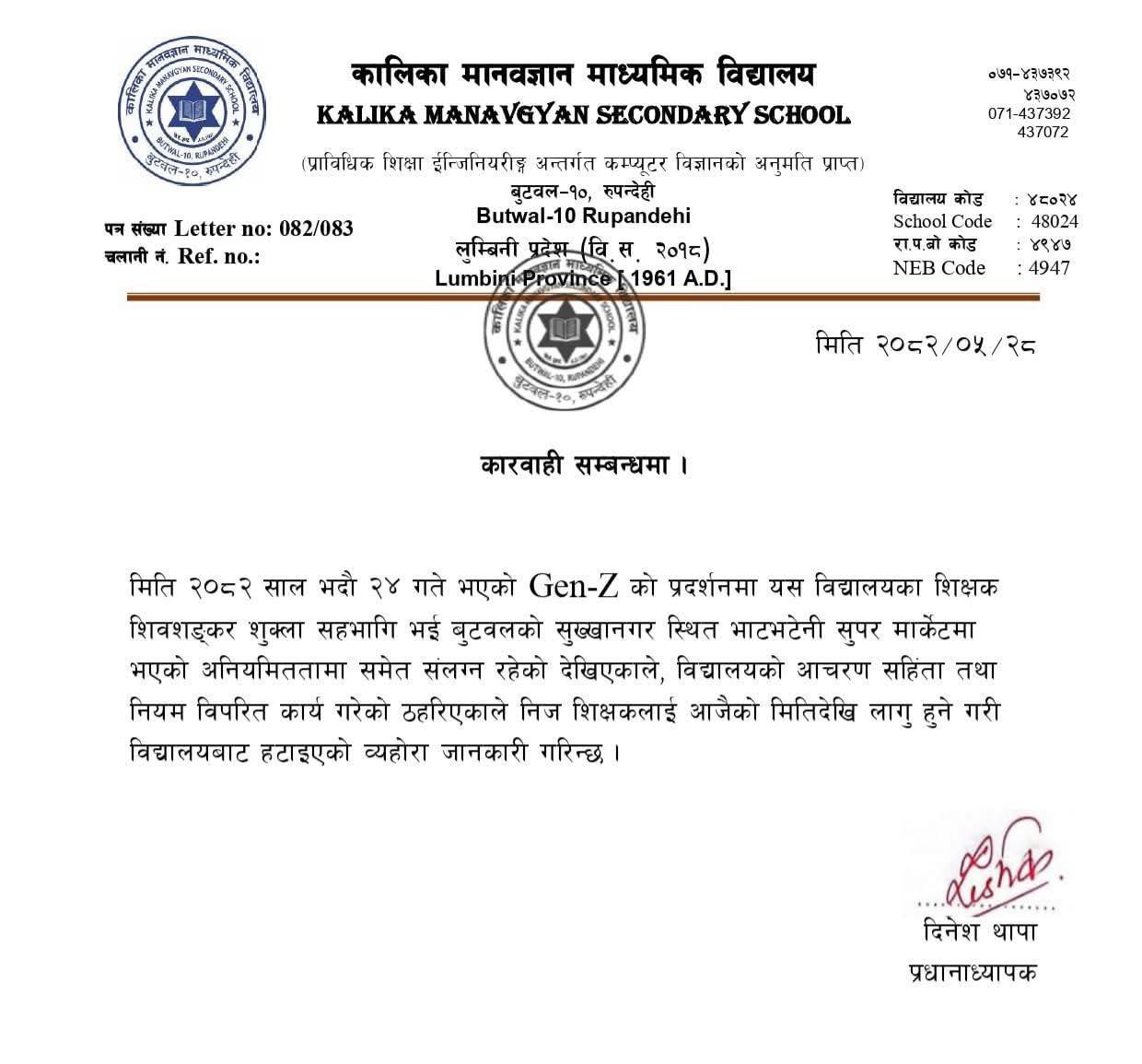 रुपन्देही । ‘जेनजी’ आन्दोलनका क्रममा बुटवलको भाटभटेनी सुपरमार्केटमा आइसक्रिम चोरेको आरोपमा बुटवलको कालिका मानवज्ञान स्कुलले आफ्ना एक शिक्षकलाई निष्कासन गरेको छ ।