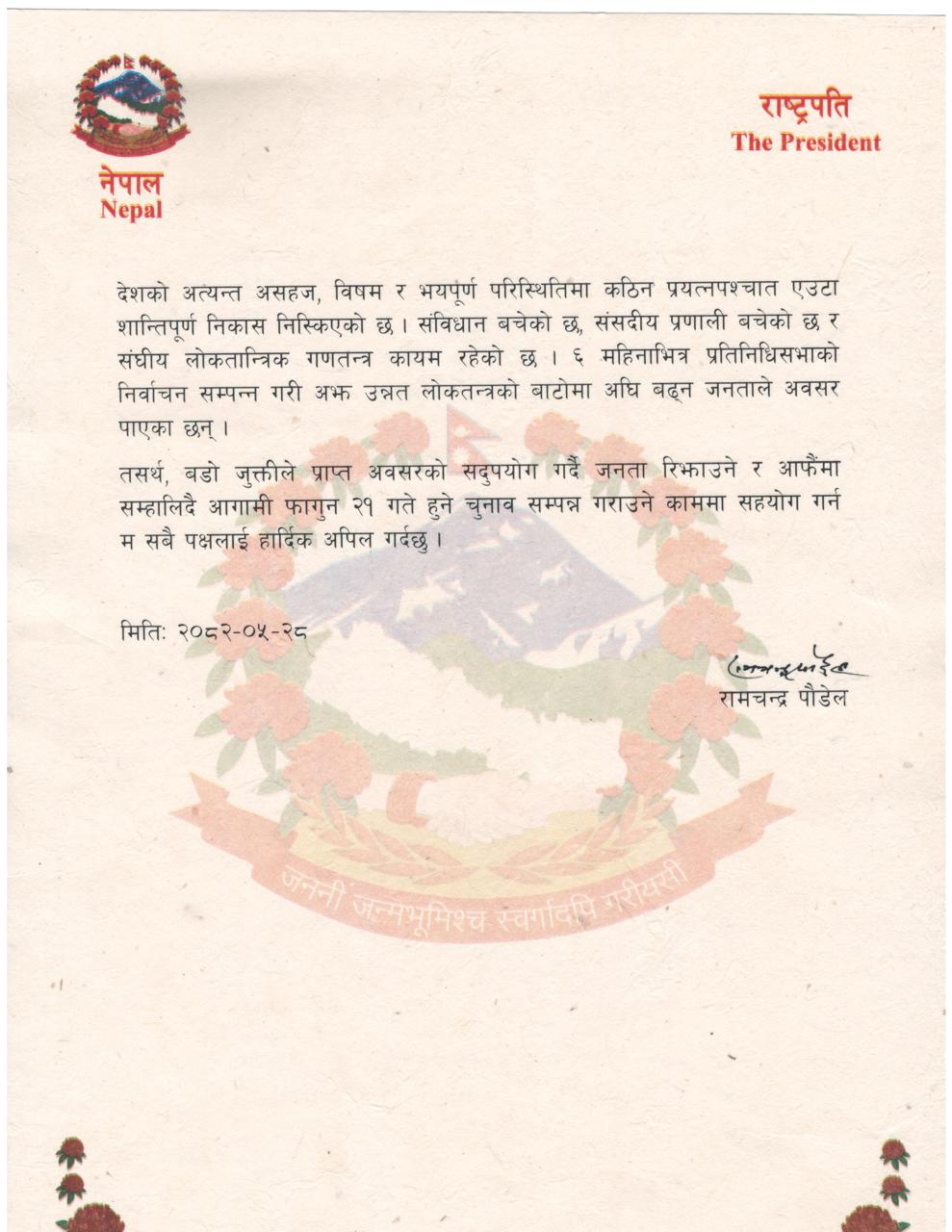 राष्ट्रपति पौडेलले शनिबार एक वक्तव्य जारी गरी बडो जुक्तीले प्राप्त अवसरको सदुपयोग गर्दै जनता रिझाउने र आफैंमा सम्हालिँदै आगामी फागुनका लागि तोकिएको चुनाव सम्पन्न गराउन सबै पक्षलाई अपिल गरेका हुन् ।