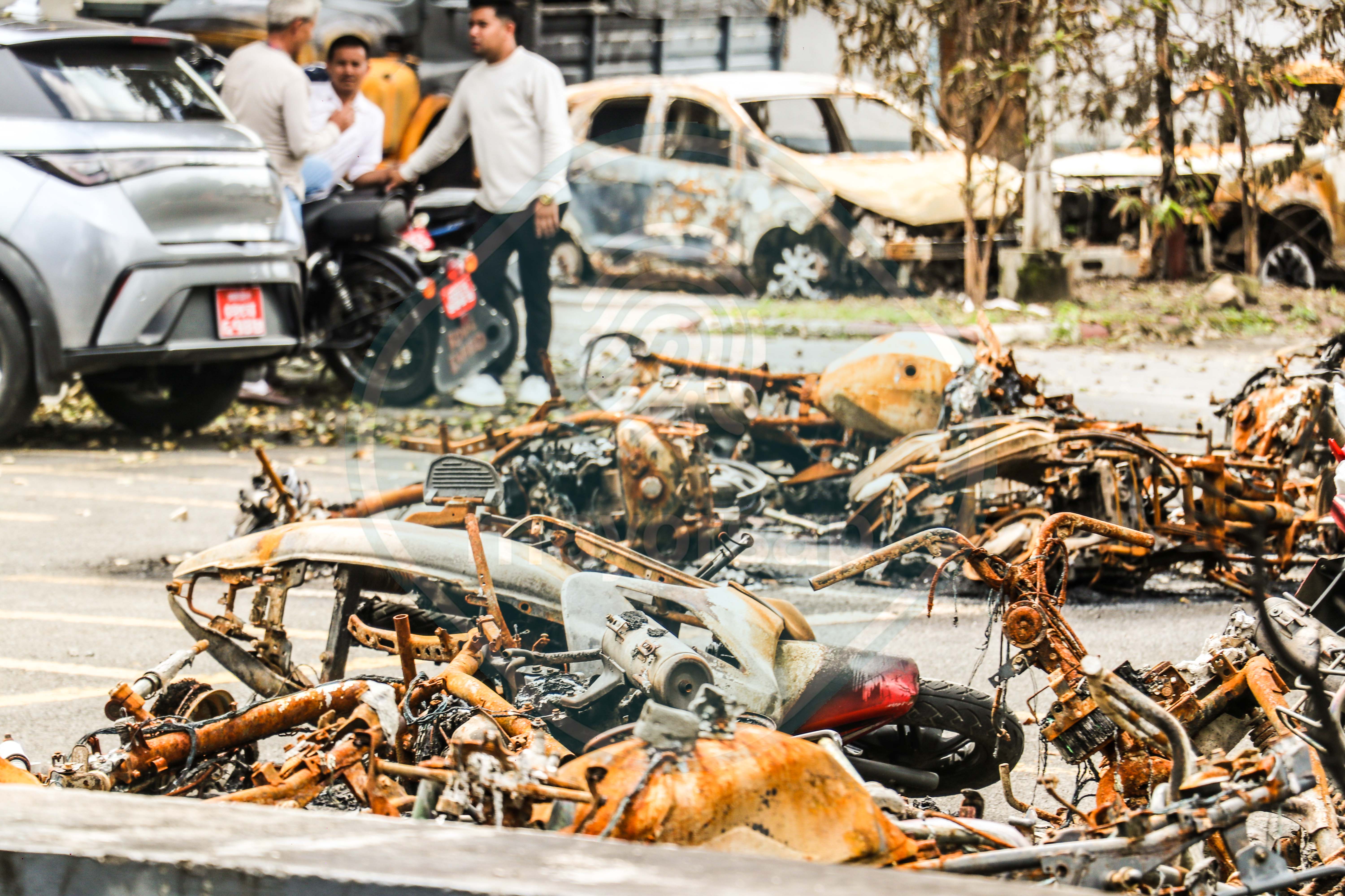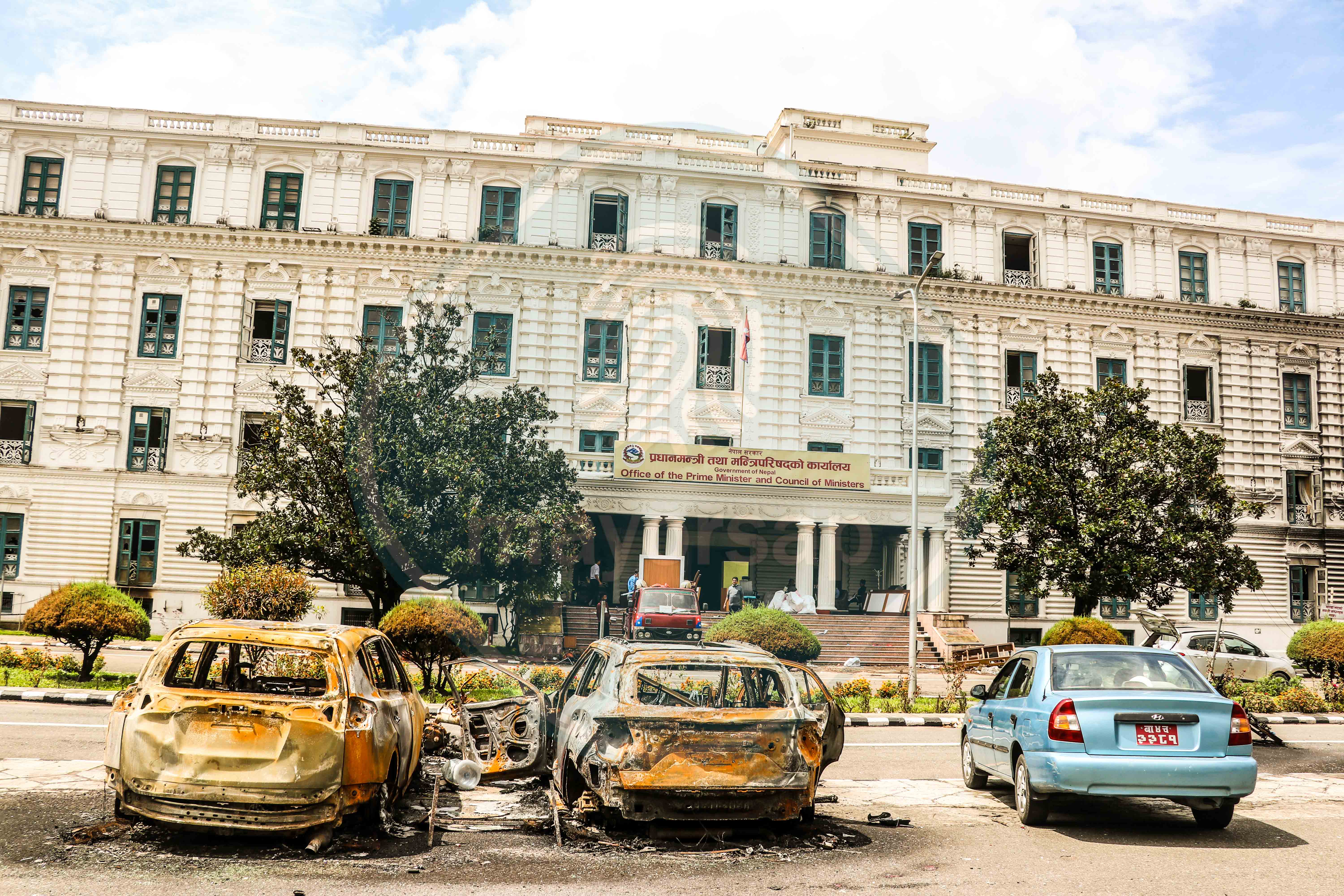 काठमाडौं । जेनजी प्रदर्शनका क्रममा राजधानीको प्रशासनिक केन्द्र सिंहदरबारमा तोडफोड र आगजनी भएको आज ७ औं दिन पनि प्रधानमन्त्री तथा मन्त्रीपरिषद्को कार्यालयमा आगो बलिरहेकै छ । सिंहदरबारमा प्रधानमन्त्रीको कार्यालय सबैभन्दा बढी निसानामा परेको देखिन्छ । उक्त कार्यालयको अगाडि पट्टिको भाग बाहिरबाट धेरै क्षति भएको नदेखिए पनि भवनभित्र र पछाडि पट्टिको भाग हेर्ने हो भने पूर्ण रुपमै क्षति भएको देखिन्छ । पछाडि पट्टि अहिले पनि आगो बलिरहेको र धुँवा आइरहेको छ । प्रधानमन्त्री बस्ने कार्यकक्ष पूर्ण रुपमा भत्किएको छ । प्रधानमन्त्रीको कार्यकक्षमा कुनै पनि सामाग्री सकुशल अवस्थामा छैनन् । बाहिर पार्किङमा राखिएका करिब १५ वटा गाडी समेत पूर्णरुपमा ध्वस्त भएका छन् भने प्रधामन्त्रीको कार्यालयको छेउमा रहेका २ वटा टहरा समेत जलेर काम नलाग्ने अवस्थामा पुगेको देखिन्छ । सिंहदरबारभित्रको क्षतिको विवरण आइसकेको छैन तर अन्य मन्त्रालय भन्दा प्रधानमन्त्रीको कार्यालय सबैभन्दा बढी क्षतिग्रस्त अवस्थामा छ । त्यसमा पनि सबैभन्दा बढी तहसनहर प्रधानमन्त्रीको कार्यकक्ष छ, जहाँ तोडफोड गरेर अगजनी गरेको देखिन्छ ।
