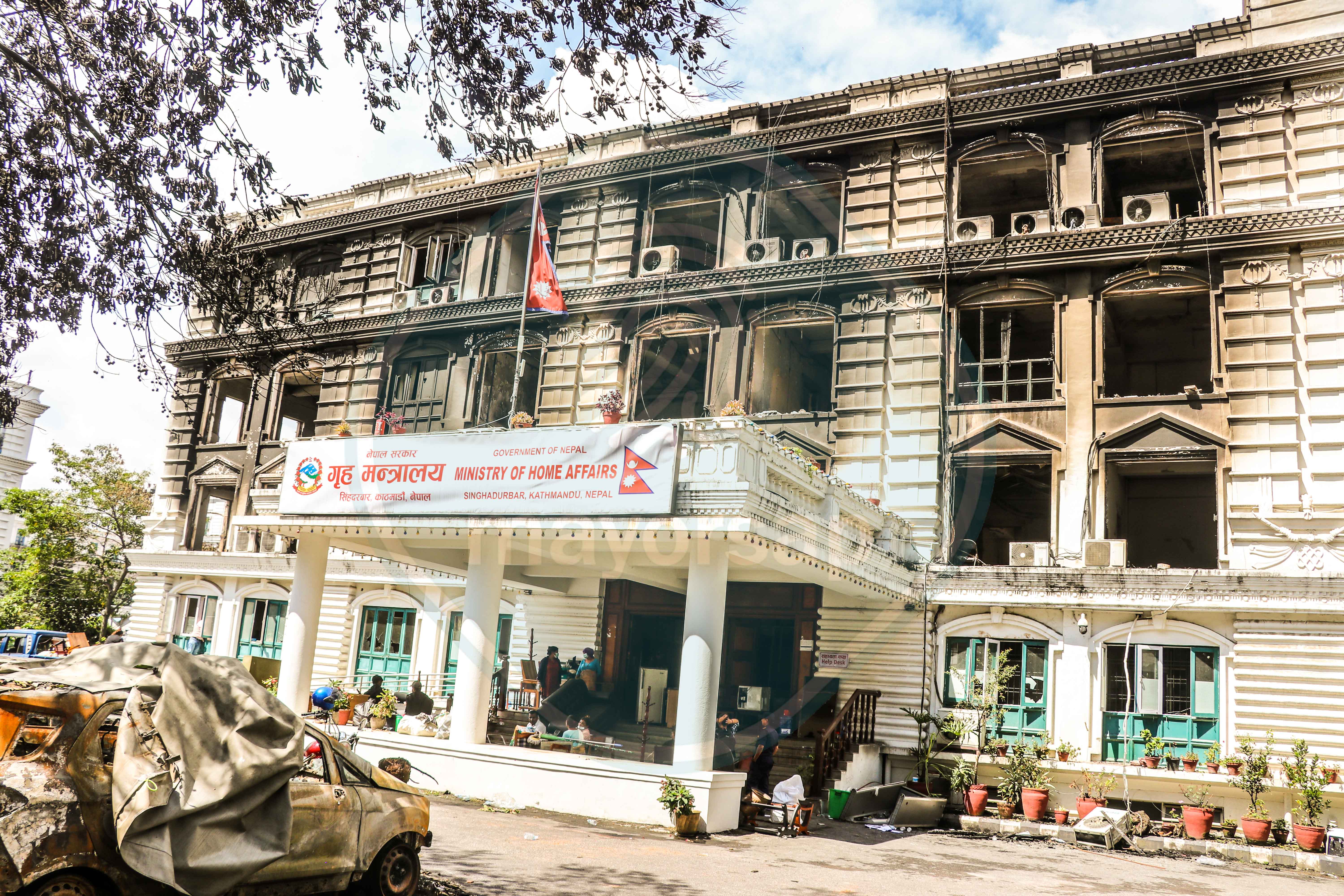 त्यसैगरी प्रधानमन्त्री तथा मन्त्रीपरिषद्को कार्यालयसँगै गृहमन्त्रालय पनि सबैभन्दा बढी ध्वस्त भएको छ । गृहमन्त्रालयका अधिकांश कोठा कामै नलाग्ने गरी ध्वस्त भएका छन् । यहाँ कुनै पनि सामाग्री सकुशल अवस्थामा छैनन् । प्रहरीलाई गोली चलाउन आदेश दिएकाे विषयमा तत्कालीन गृहमन्त्री रमेश लेखकसँग सबैभन्दा बढी रुष्ट देखिएका प्रदर्शनकारीले गृहमन्त्रालय निसानामै राखेर तोडफोडपछि आगजनी गरेको देखिन्छ । यहाँ गृहमन्त्रीको कार्यकक्षसमेत पूर्ण रुपमा ध्वस्त भएको छ । बाहिर पार्किङमा राखिएका सबै सवारी साधन समेत जलेर नष्ट भएका छन् । गृहमन्त्रालयको प्राङ्गणमा रहेका रुद्राक्षका रूख समेत जलेका छन् । अहिले गृहमन्त्रालय पुरानो सामान्य प्रशासन मन्त्रालय रहेको भवनमा सारिएको छ । नवनियुक्त गृह तथा कानुन मन्त्री ओमप्रकाश अर्यालले सोही भवनमा पदभार ग्रहण गरेका छन् ।