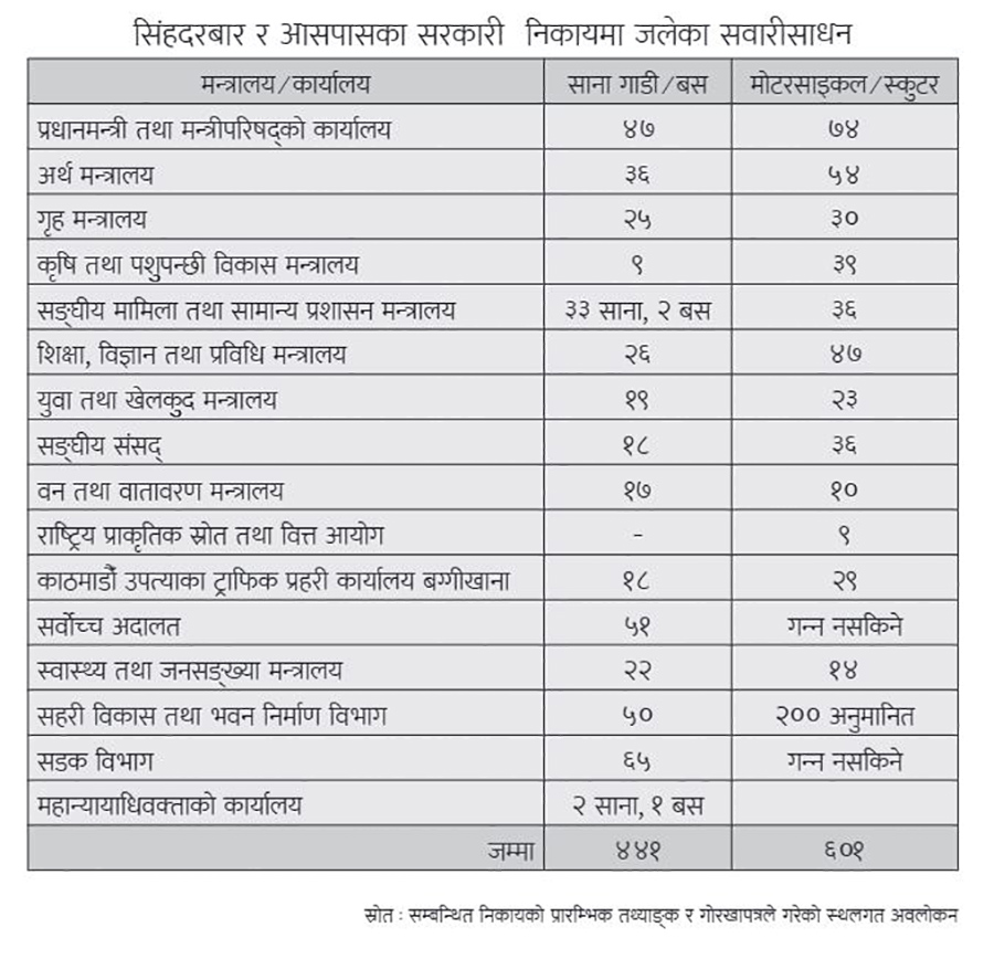 सिंहदरबार र आसपासका सरकारी निकायमा कति जले सरकारी गाडी ?