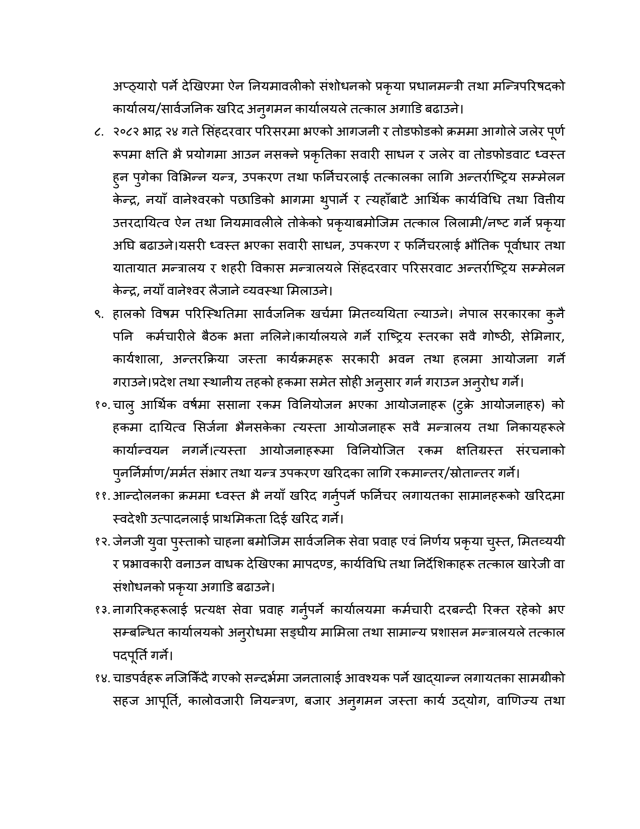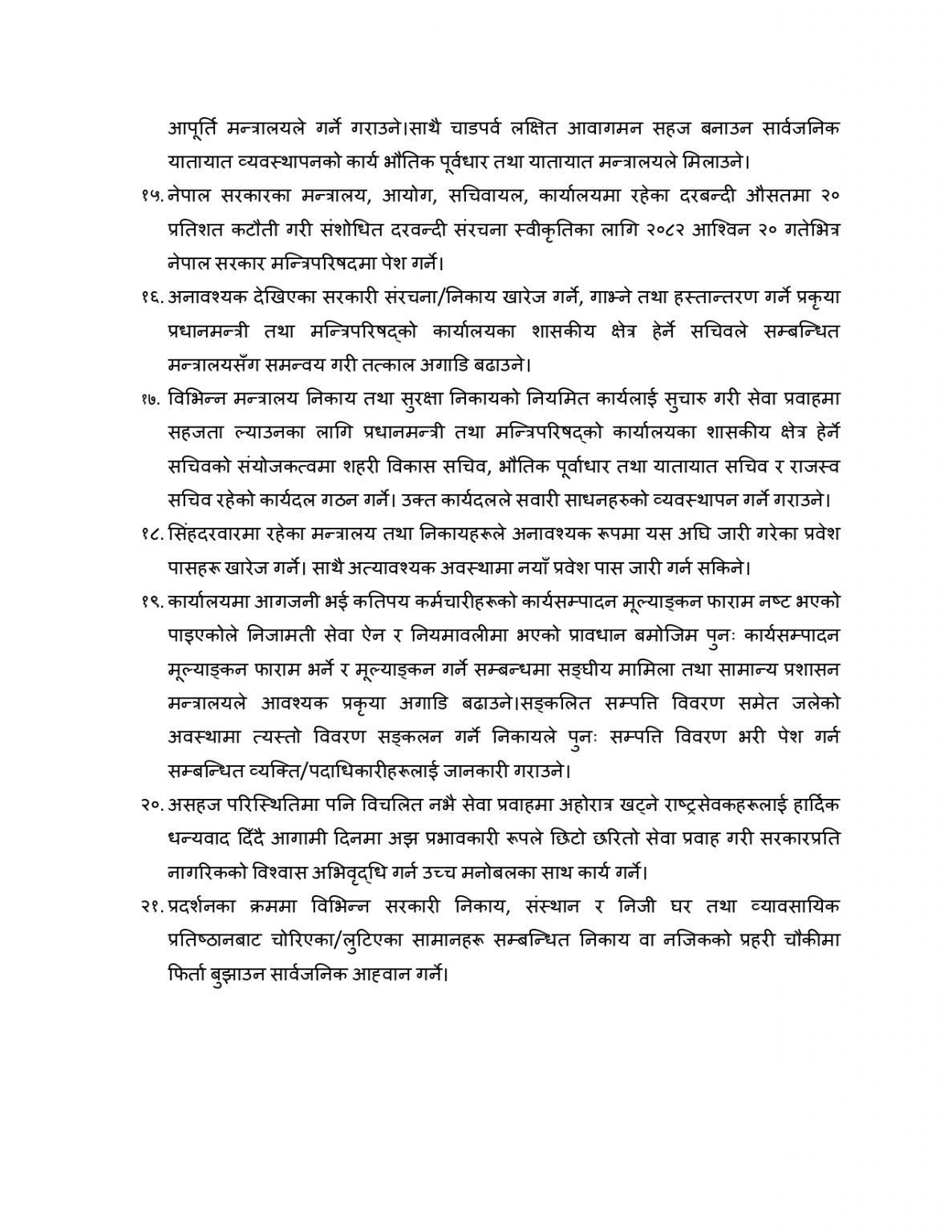 बैठकले संशोधित संरचना स्वीकृतिका लागि २०८२ आश्विन २० गतेभित्र मन्त्रिपरिषदमा पेश गर्ने निर्णय गरेको छ । अनावश्यक सरकारी संरचना र निकायलाई खारेज, गाभ्ने वा हस्तान्तरण गर्ने प्रक्रियासमेत तत्काल अघि बढाइने बताइएको छ । त्यसका लागि प्रधानमन्त्री तथा मन्त्रिपरिषद कार्यालयका शासकीय क्षेत्र हेर्ने सचिवले समन्वय गर्नेछन् ।