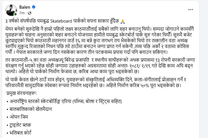 आज सामाजिक सञ्जालमार्फत् उनले ६ करोड ७० लाखको लागतमा निर्माण सम्पन्न हुने पार्कका केही तस्बिरसमेत सार्वजनिक गरेका छन् । आफू मेयर बनेदेखि नै काठमाडौंलाई सबैको सहर बनाउने उद्देश्यस्वरुप यमबुद्ध स्केटबोर्ड पार्क निर्माणको लक्ष्य राखेको उनले बताएका छन्। पार्कमा अन्तर्राष्ट्रिय स्तरको स्केटबोर्डिङ्ग एरिया र्याम्प्स, बोल्स र स्ट्रिट्स सहित), बालबालिकाको खेलमैदान, ओपन जिम, ट्वाइलेट ब्लक र भलिबल कोर्ट निर्माण गरिनेछ ।