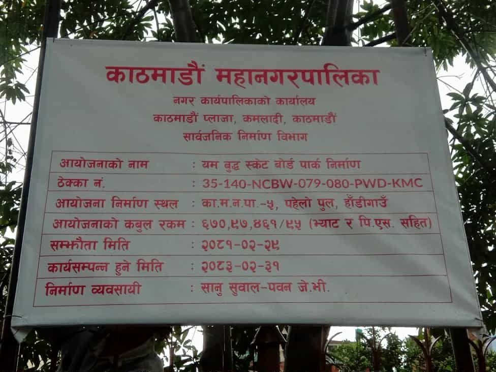 काठमाडौं । काठमाडौं महानगरपालिकाले यमबुद्ध पार्क निर्माणाधीन गरिरहेको छ । महानगरको वडा नम्बर ५ मा बनिरहेको यो पार्कको नाम यमबुद्ध स्केटबोर्ड पार्क नामकरण गरिएको छ । काठमाडौं महानगरपालिकाका मेयर बालेन्द्र शाह (बालेन)ले तीन वर्ष लामो संघर्षपछि यमबुद्ध स्केटबोर्ड पार्कको सपना साकार हुन लागेको बताएका छन् ।