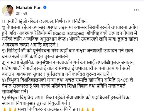 त्यसैगरी मन्त्री पुनले नेपालमा रहेका क्यान्सर अस्पतालहरूमा क्यान्सर बिरामीहरुको उपचारमा प्रयोग हुने अतिआवश्यक रेडियोधर्मी औषधिहरूको उत्पादन नेपालमै गर्नको लागि आणविक अनुसन्धान केन्द्र (औषधि उपचारको लागि मात्र) तुरुन्त खोल्न आवश्यक कदम अगाडि बढाउने निर्णय भएको जानकारी दिएका छन् ।