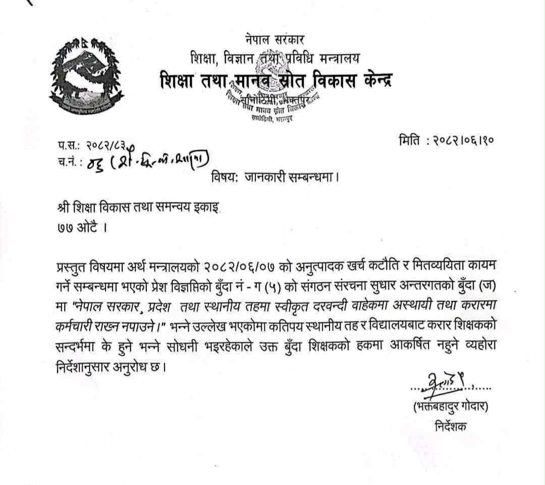 शिक्षा तथा मानव स्रोत विकास केन्द्रले ७७ वटै शिक्षा विकास तथा समन्वय इकाइलाई परिपत्र गरी अर्थ मन्त्रालयको उक्त निर्णय शिक्षकको हकमा लागू नहुने जानकारी गराएको छ ।