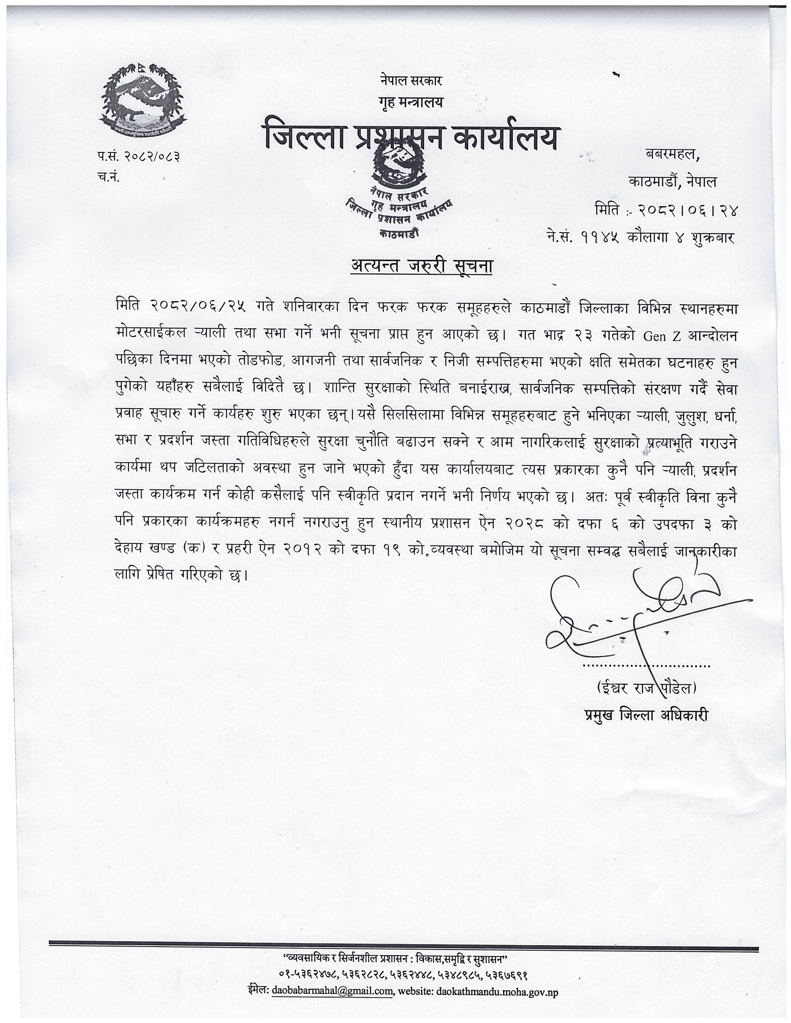 प्रमुख जिल्ला अधिकारी ईश्वर राज पौडेलद्वारा हस्ताक्षरित अत्यन्त जरुरी सूचनामा शान्ति–सुरक्षा कायम राख्न र सार्वजनिक सम्पत्ति जोगाउन यस्तो निर्णय गरिएको उल्लेख छ ।